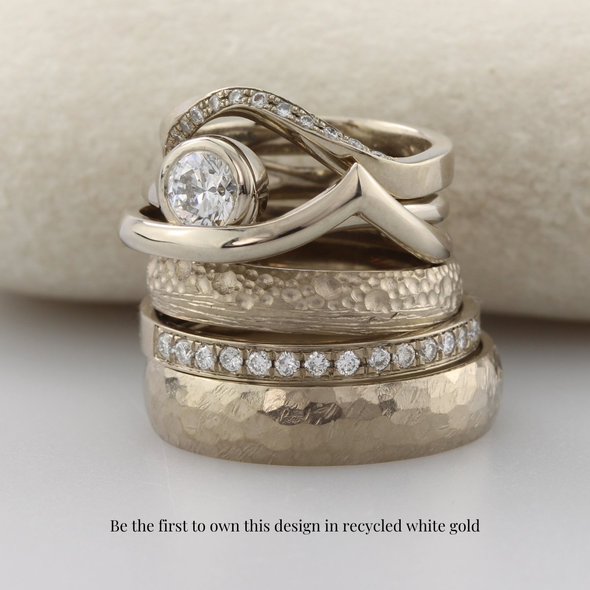 A solid 14ct white gold stacking ring with a polished finish handmade from ethical recycled gold and enhanced with natural… Read More +
