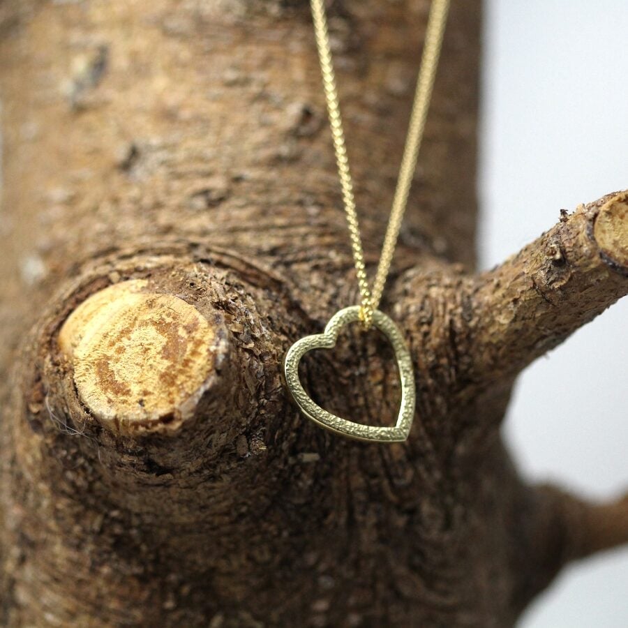 A solid 18ct yellow gold square profile hammered heart pendant, handmade from ethical recycled gold and enhanced with natural river gold, gifted to you by us. Choose your river gold location to make your necklace extra special.