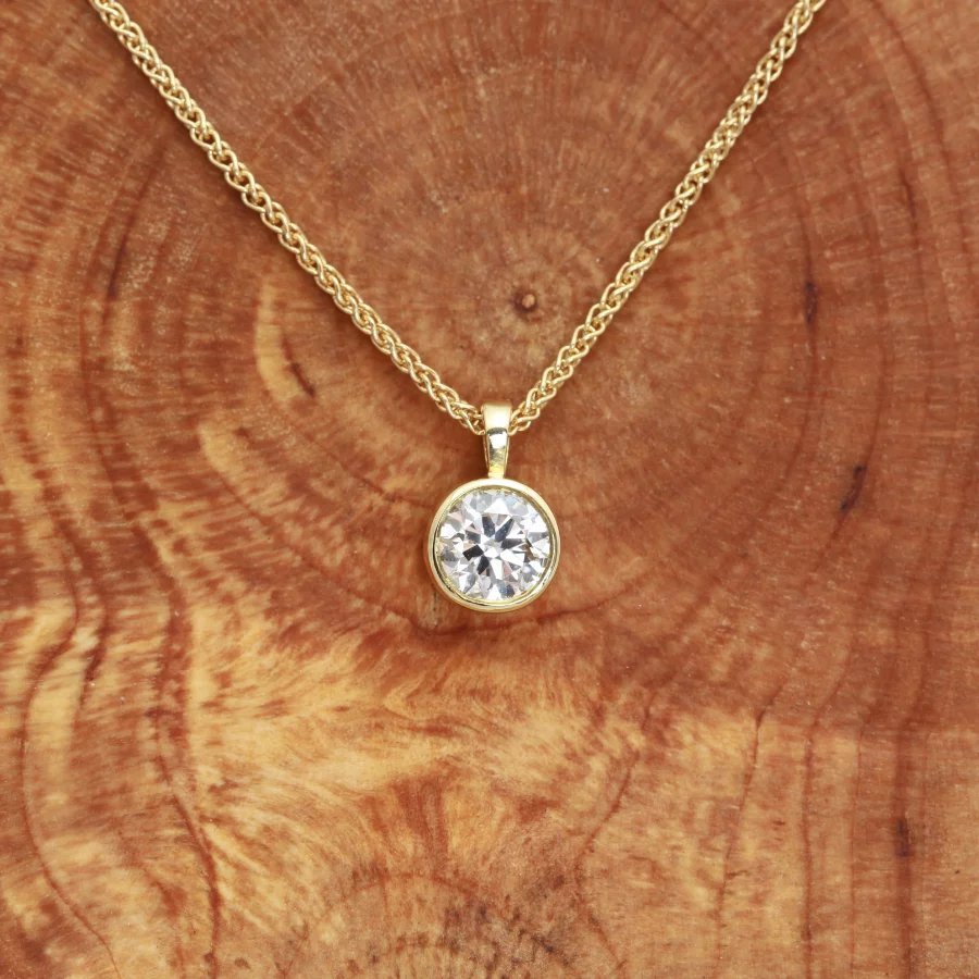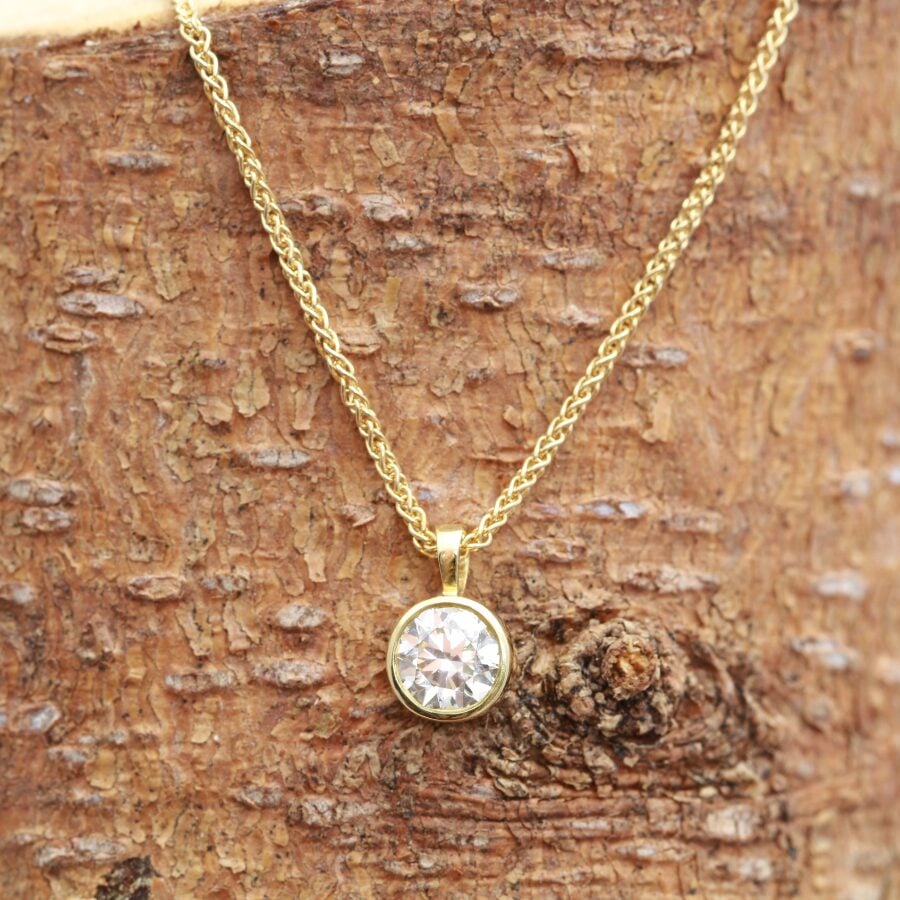 A classic 18ct yellow gold round rub over diamond or moissanite pendant handmade from ethical recycled gold and enhanced using natural river gold, gifted to you by us. Choose your river gold location to make your pendant extra special.