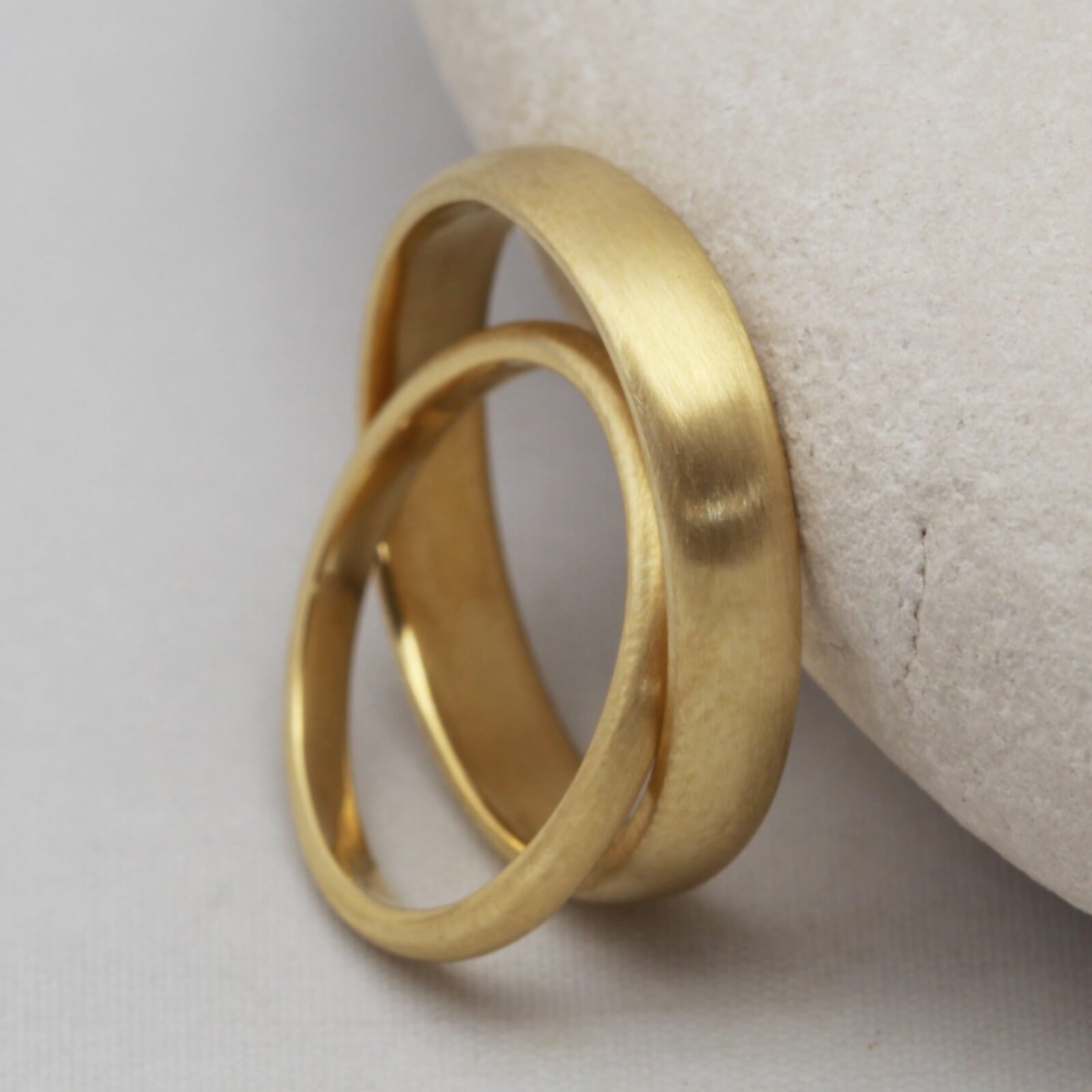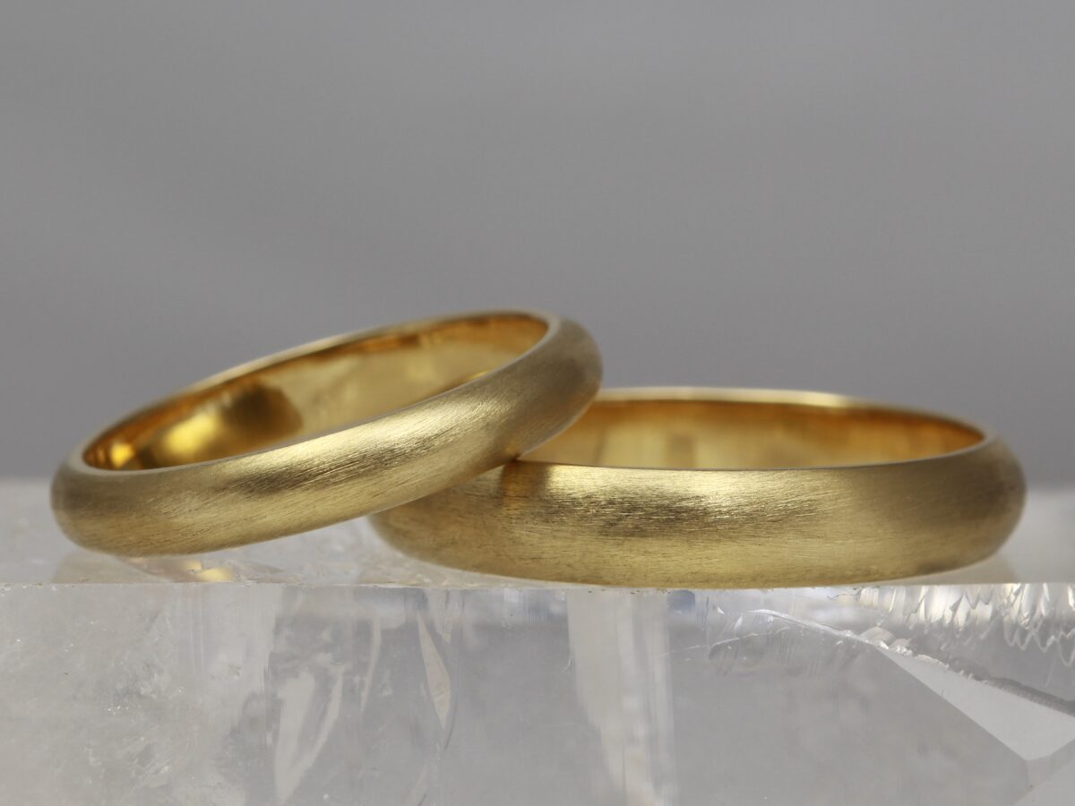 We don’t cast our rings, But for a pair of wedding rings we can do even better than casting them from the same mould. Every ring we make is individually handcrafted using traditional techniques, from making our own alloys, to drawing our own wire. If you buy a pair of rings in the same metal, we always make both your rings from the same melt, meaning they are chemically inseparable. If you buy a pair of rings but in different metals, we can usually incorporate a bead of each metal in the underside of each of the others’ rings, so your rings can still be connected at the atomic scale.
