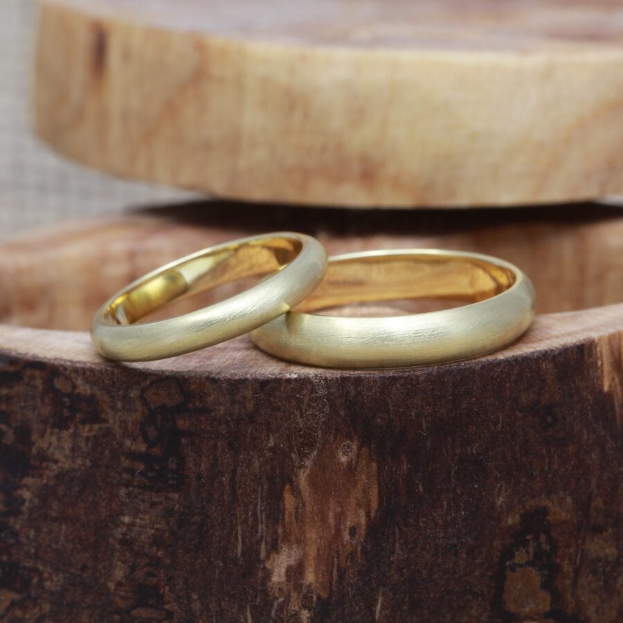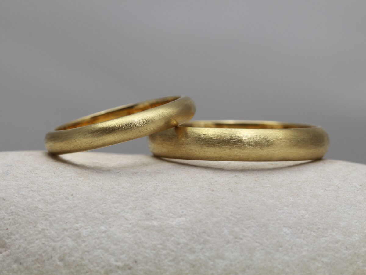 A matching pair of solid 9ct gold D shape profile wedding rings with a matt finish. Handmade from ethical recycled gold and enhanced using natural river gold, gifted to you by us. Choose your river gold location to make your rings extra special. Two rings created using the same metal will be made chemically inseparable having started life rolling around the crucible as one molten bead of precious metal.