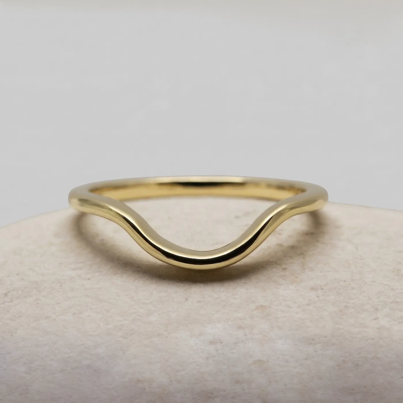 A solid 14ct yellow gold flat profile curved wedding ring with a polished finish. Handmade from ethical recycled gold and enhanced using natural river gold, gifted to you by us. Choose your river gold location to make your ring extra special.