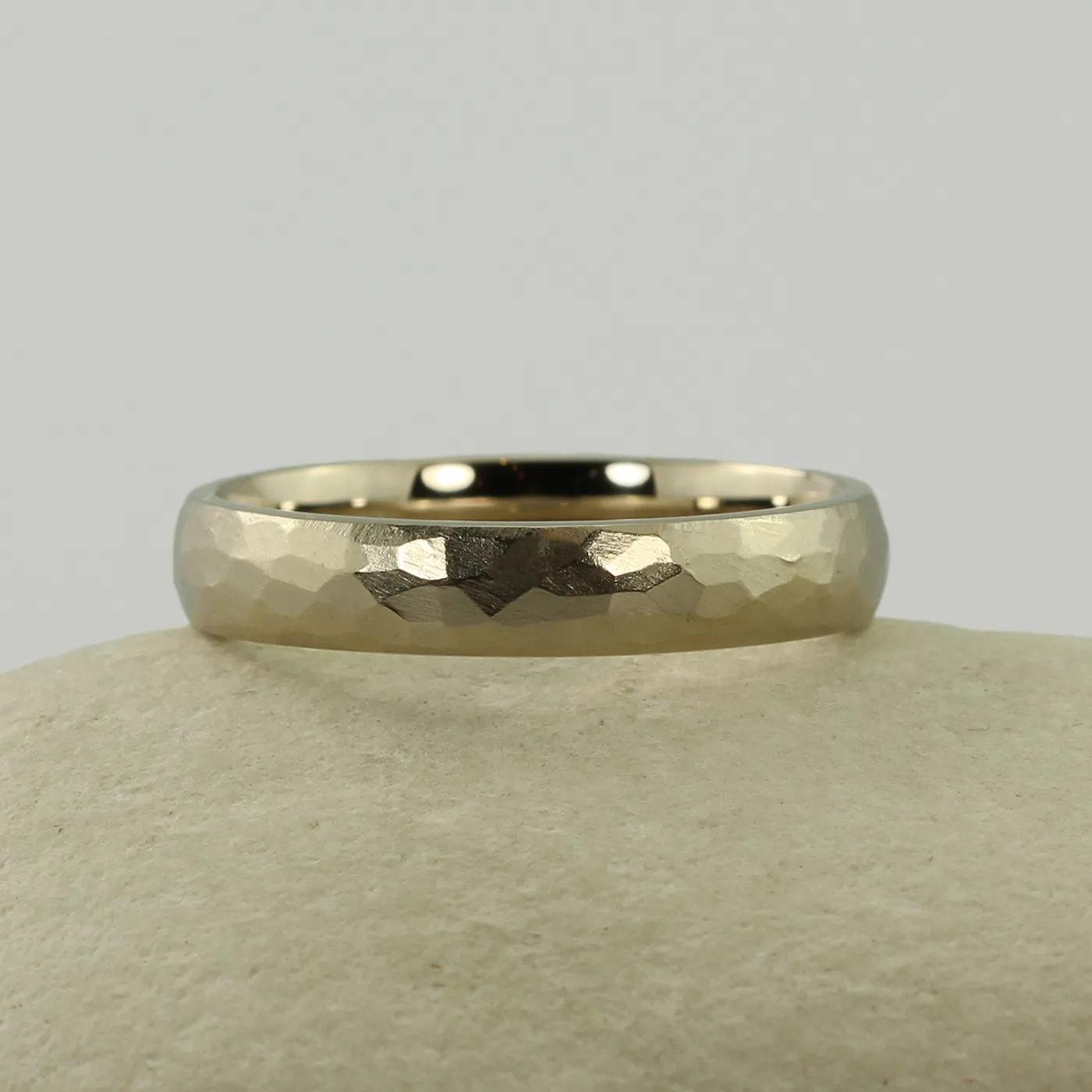 A solid 4mm 18ct white gold court profile wedding ring with a hammered finish. Handmade from ethical recycled gold and enhanced using natural river gold from England, Ireland, Scotland and Wales, gifted to you by us.