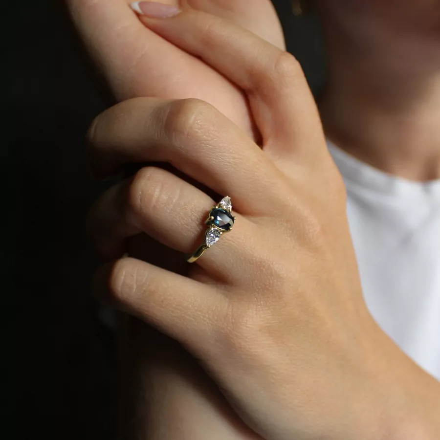 A stunning 18ct yellow gold teal sapphire trilogy engagement ring handmade from ethical recycled gold enhanced using natural river gold, gifted to you by us. . Choose from two 0.25ct recycled diamond or lab grown diamonds or two 5mm x 3mm moissanite to compliment the 1.0ct oval teal sapphire in the centre, all in a delicate basket setting.