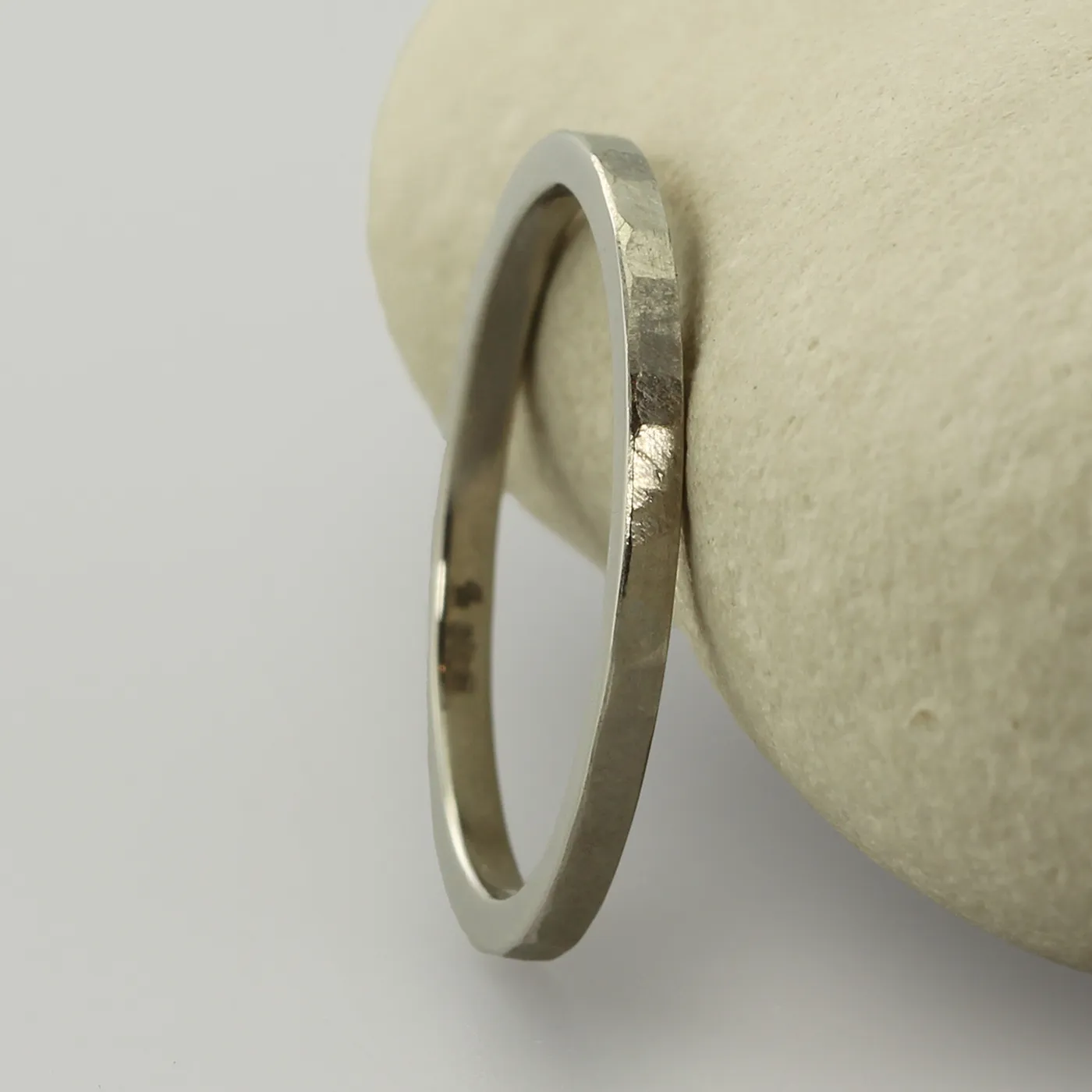 A solid 950 platinum 1.5mm wide flat profile wedding ring with a hammered finish. Handmade from ethical recycled platinum. The ring is size P and be resized to N-R free of charge.