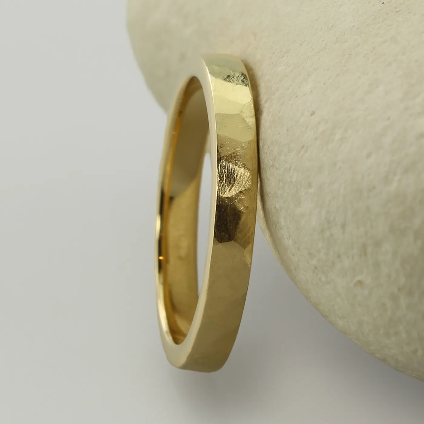 A solid 2.5mm 9ct yellow gold flat profile wedding ring with a hammered finish. Handmade from ethical recycled gold and enhanced using natural river gold from England, Ireland, Scotland and Wales, gifted to you by us.