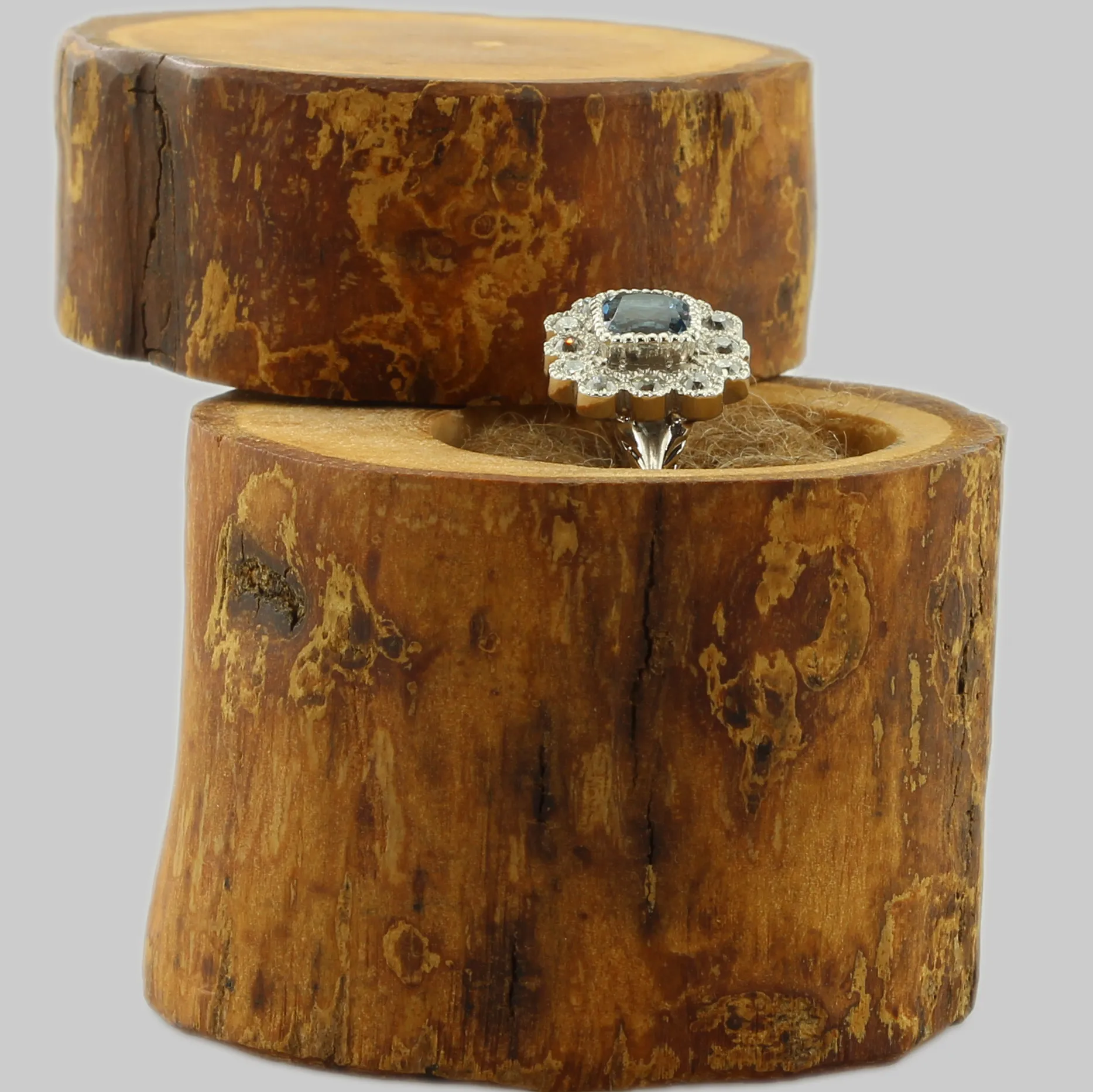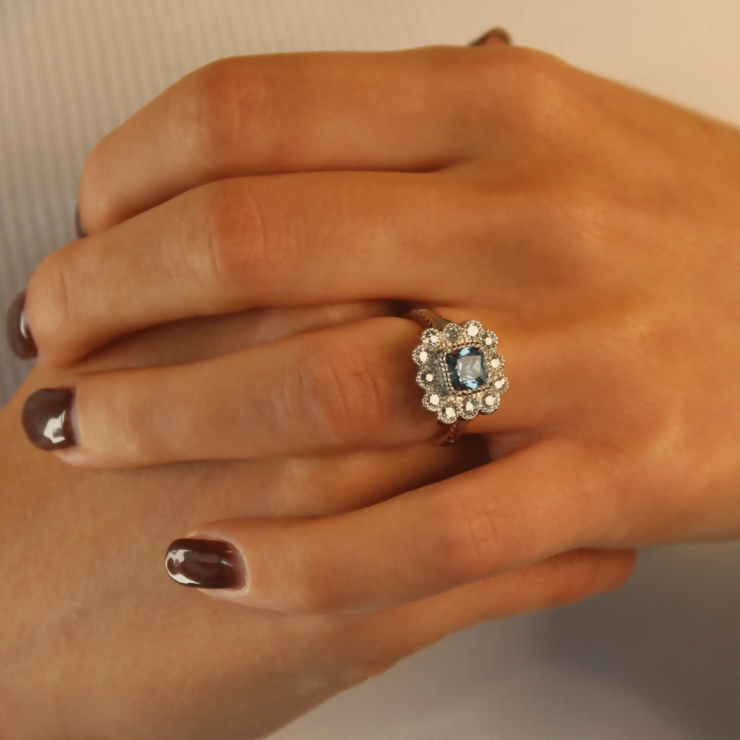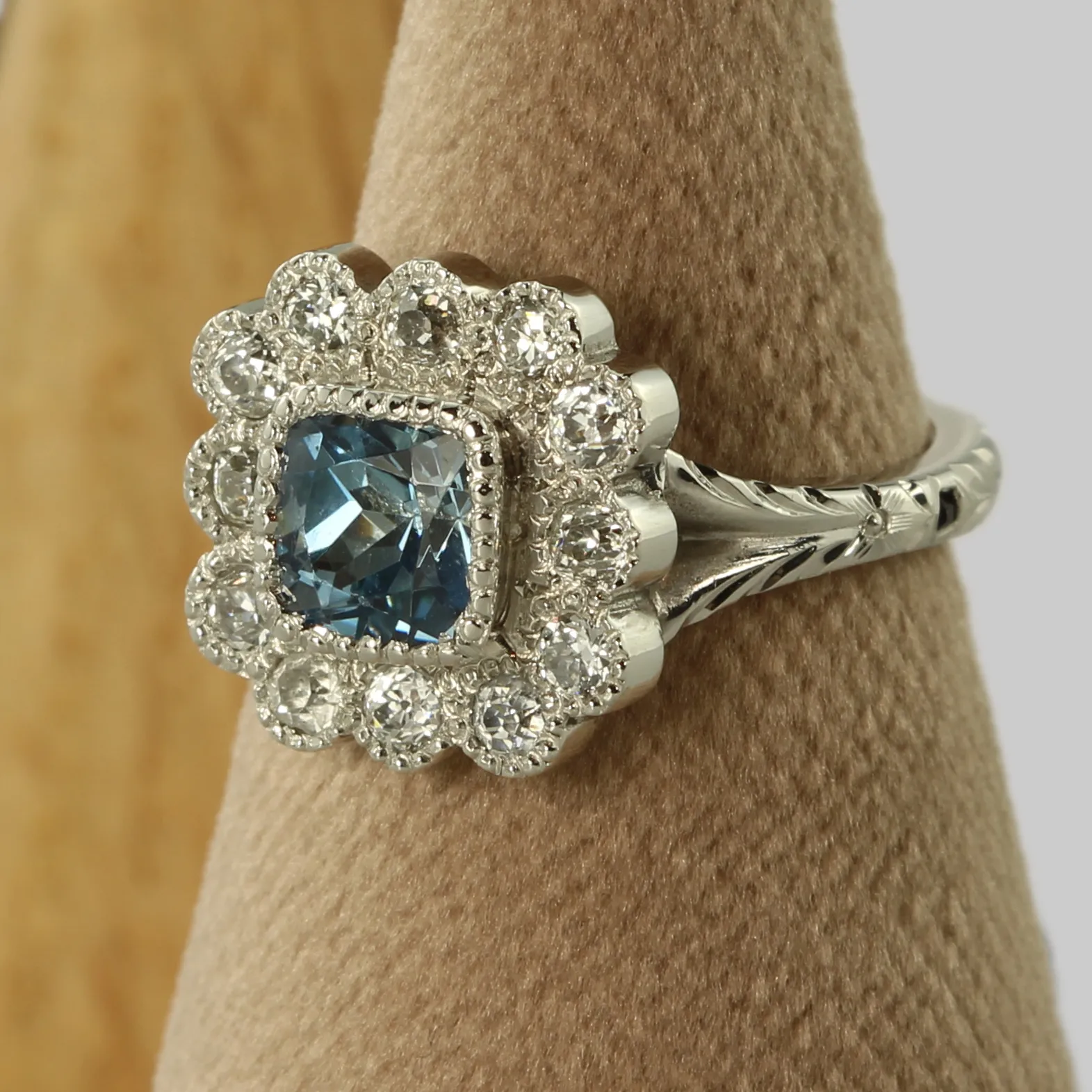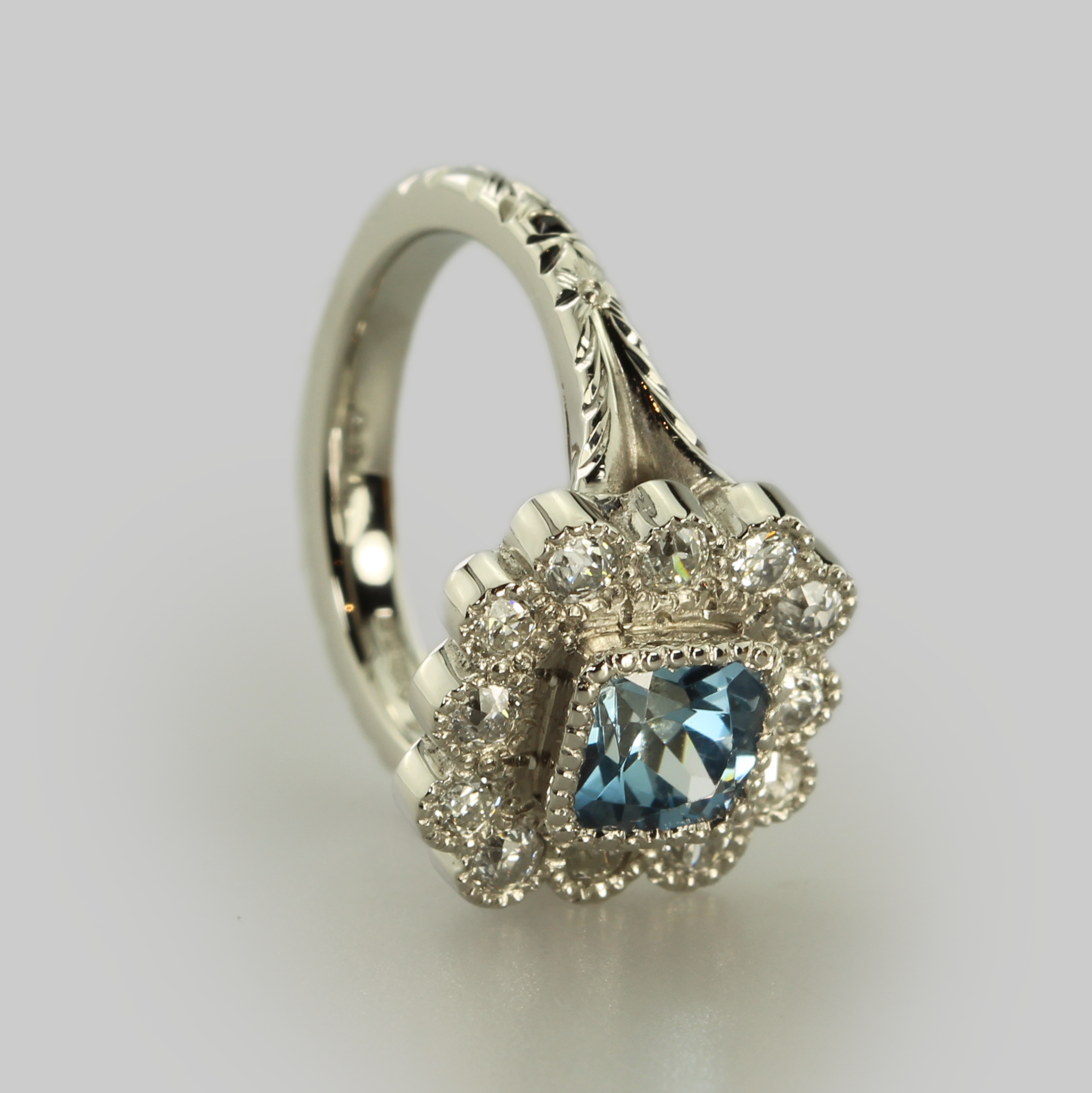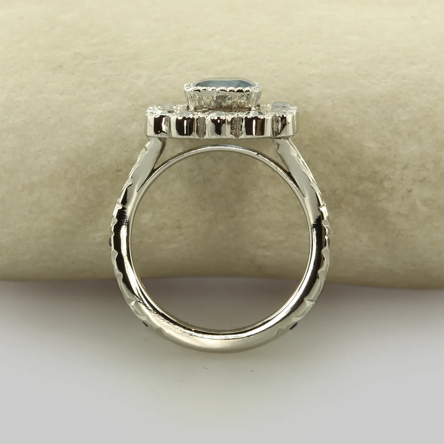 - Stone: Teal sapphire with old cut recycled diamonds in the halo