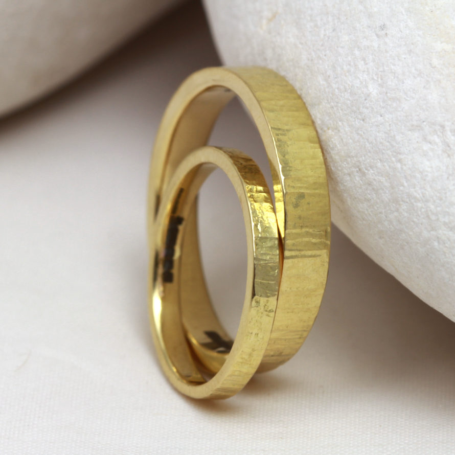 We don’t cast our rings, But for a pair of wedding rings we can do even better than casting them from the same mould. Every ring we make is individually handcrafted using traditional techniques, from making our own alloys, to drawing our own wire. If you buy a pair of rings in the same metal, we always make both your rings from the same melt, meaning they are chemically inseparable.ย If you buy a pair of rings but in different metals, we can usually incorporate a bead of each metal in the underside of each of the othersโ rings, so your rings can still be connected at the atomic scale.