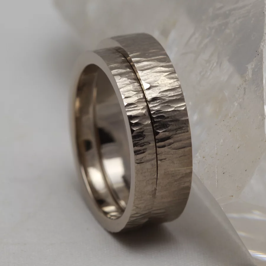We don’t cast our rings, But for a pair of wedding rings we can do even better than casting them from the same mould. Every ring we make is individually handcrafted using traditional techniques, from making our own alloys, to drawing our own wire. If you buy a pair of rings in the same metal, we always make both your rings from the same melt, meaning they are chemically inseparable.  If you buy a pair of rings but in different metals, we can usually incorporate a bead of each metal in the underside of each of the others’ rings, so your rings can still be connected at the atomic scale.
