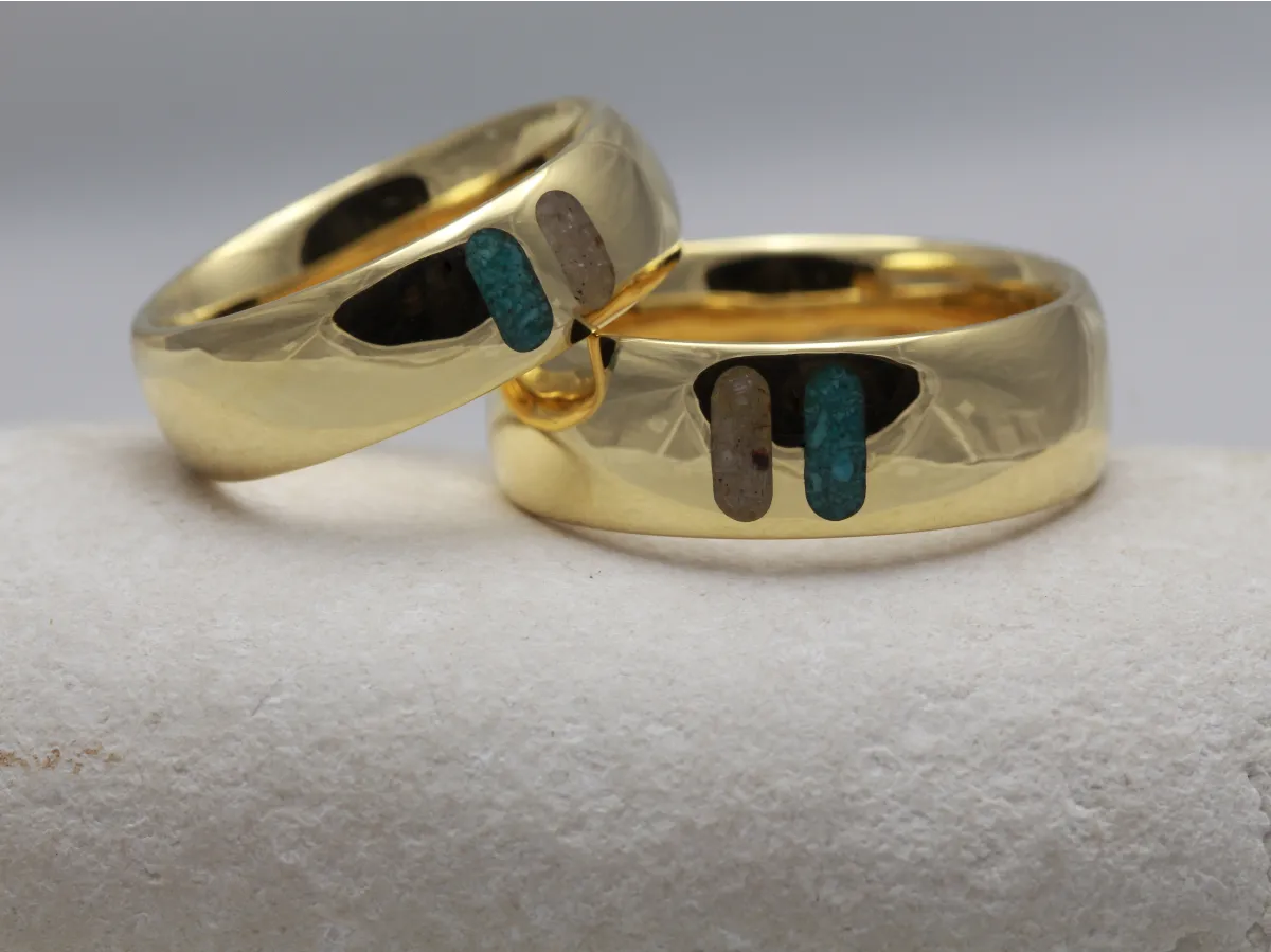 A matching set of solid 14ct gold court profile rings with a polished finish enhanced with turquoise and smoky quartz inlays. Handmade from ethical recycled gold and enhanced using natural river gold, gifted to you by us. Choose your river gold location to make your ring extra special.