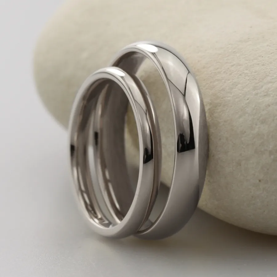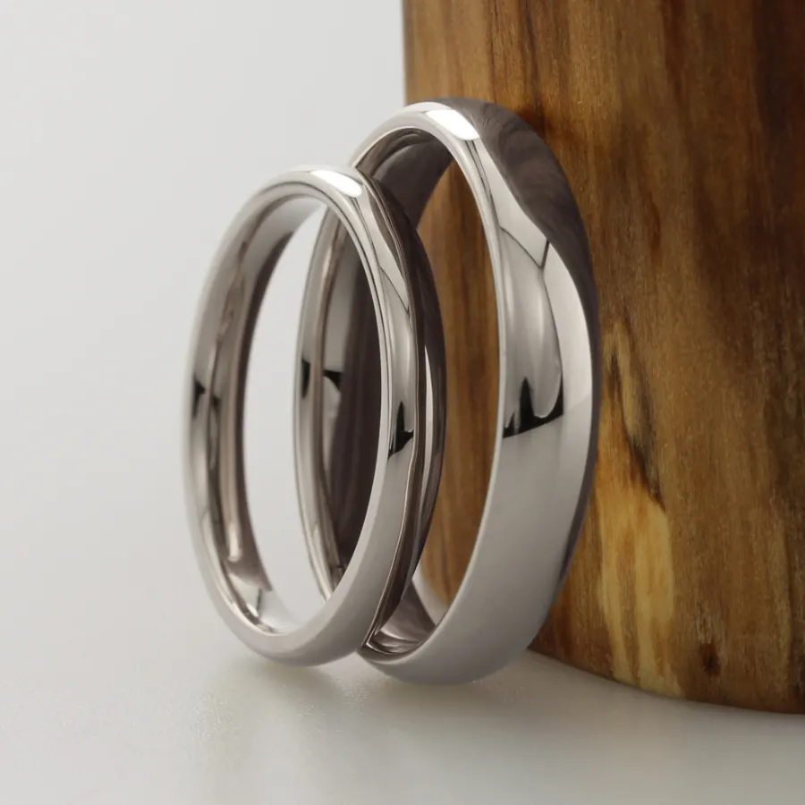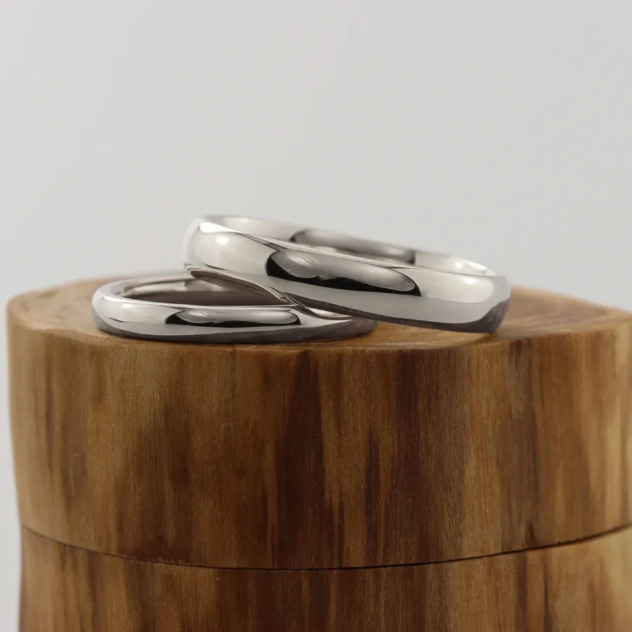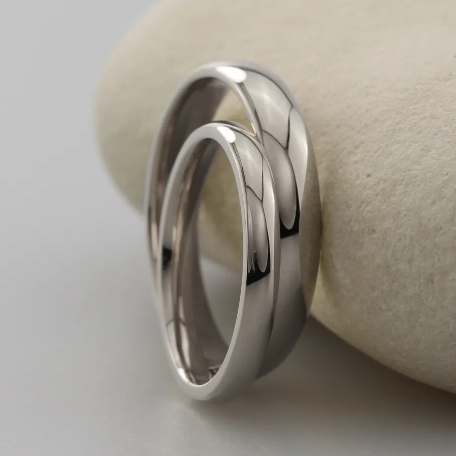 A matching pair of solid 950 platinum court profile wedding rings with a polished finish. Handmade from ethical recycled platinum.ย Two rings created using the same metal will be made chemically inseparable having started life rolling around the crucible as one molten bead of precious metal.