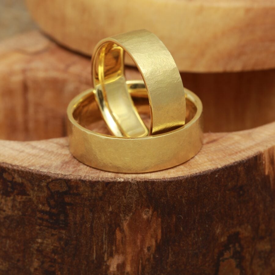 A matching pair of solid 18ct yellow gold comfort profile wedding rings with a hammered finish. Handmade from ethical recycled gold and enhanced using natural river gold, gifted to you by us. Choose your river gold location to make your rings extra special.
