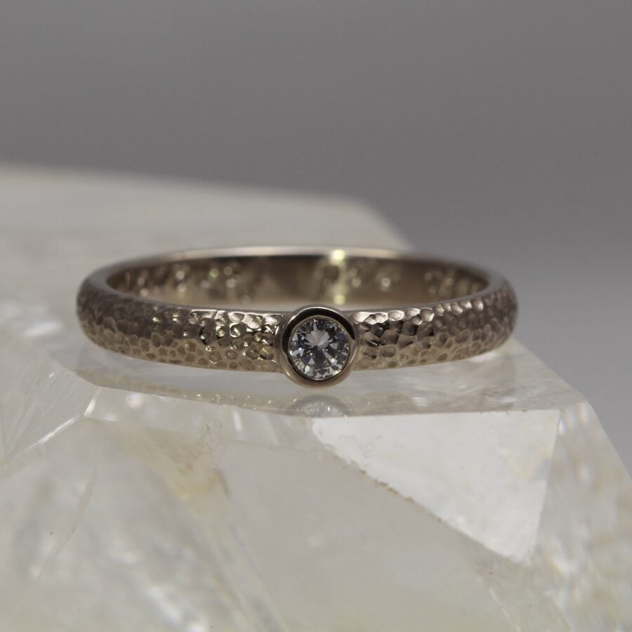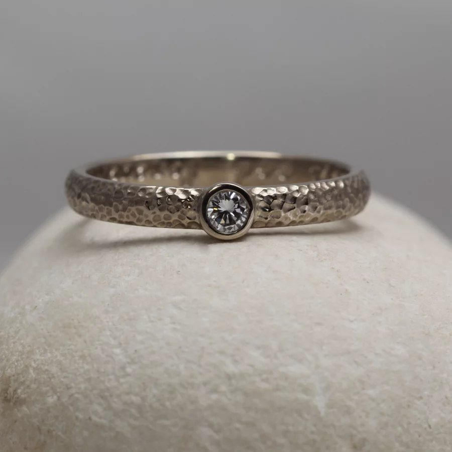 A solid 18ct white gold engagement ring with a round moissanite, lab grown diamond or recycled diamond in a rub over setting on a hammered band.ย The ring is handmade from ethical recycled gold enhanced using natural river gold, gifted to you by us. Choose your river gold location to make your ring extra special.