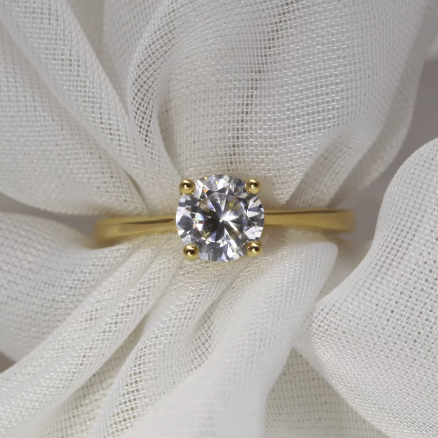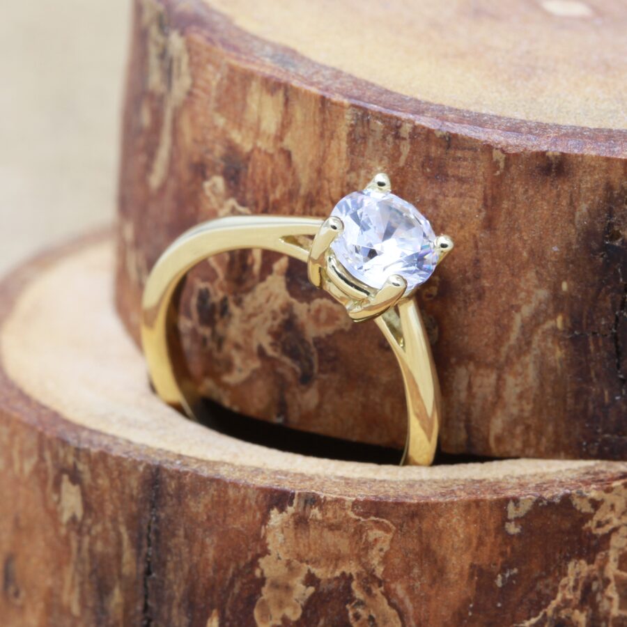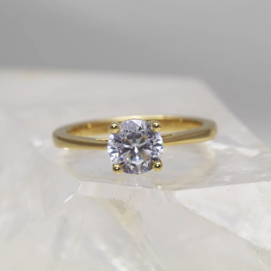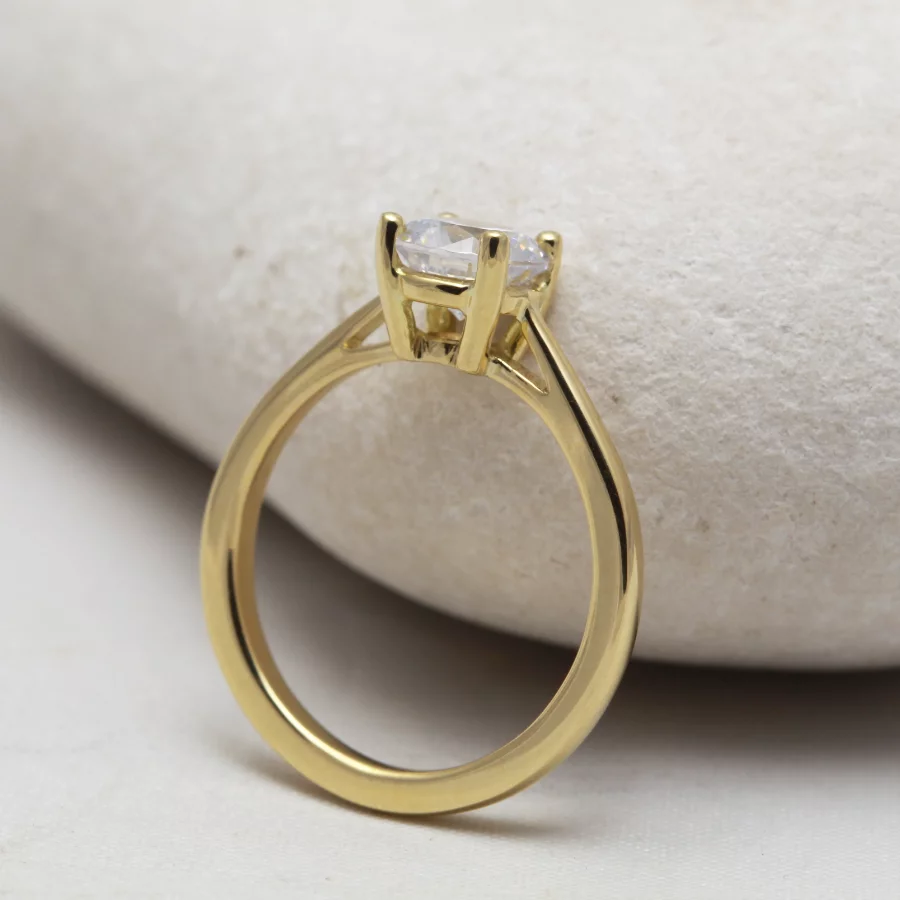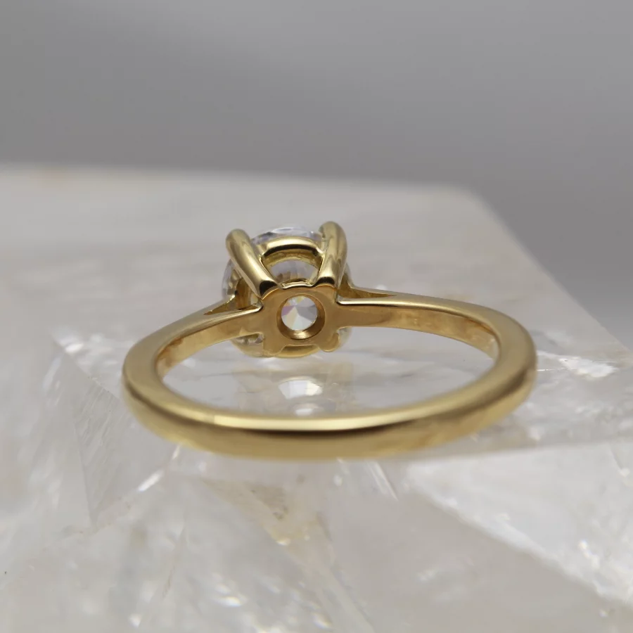 A solid 18ct yellow gold engagement ring with an ethical recycled diamond, lab grown diamond or moissanite set into a handmade basket setting with four claws.