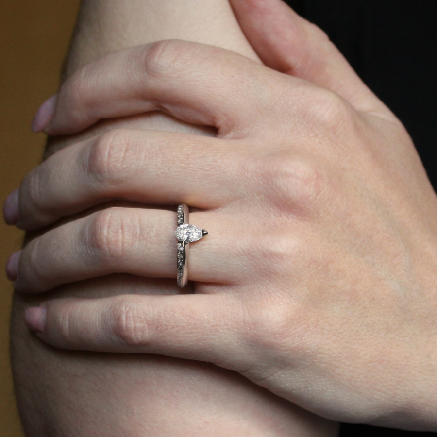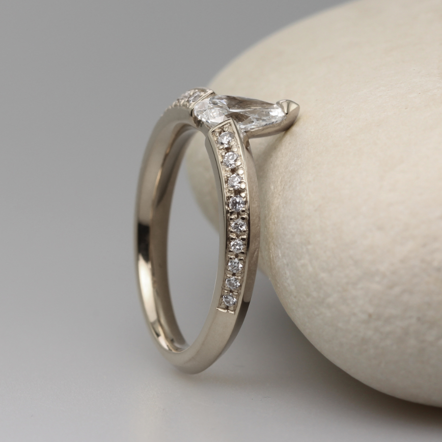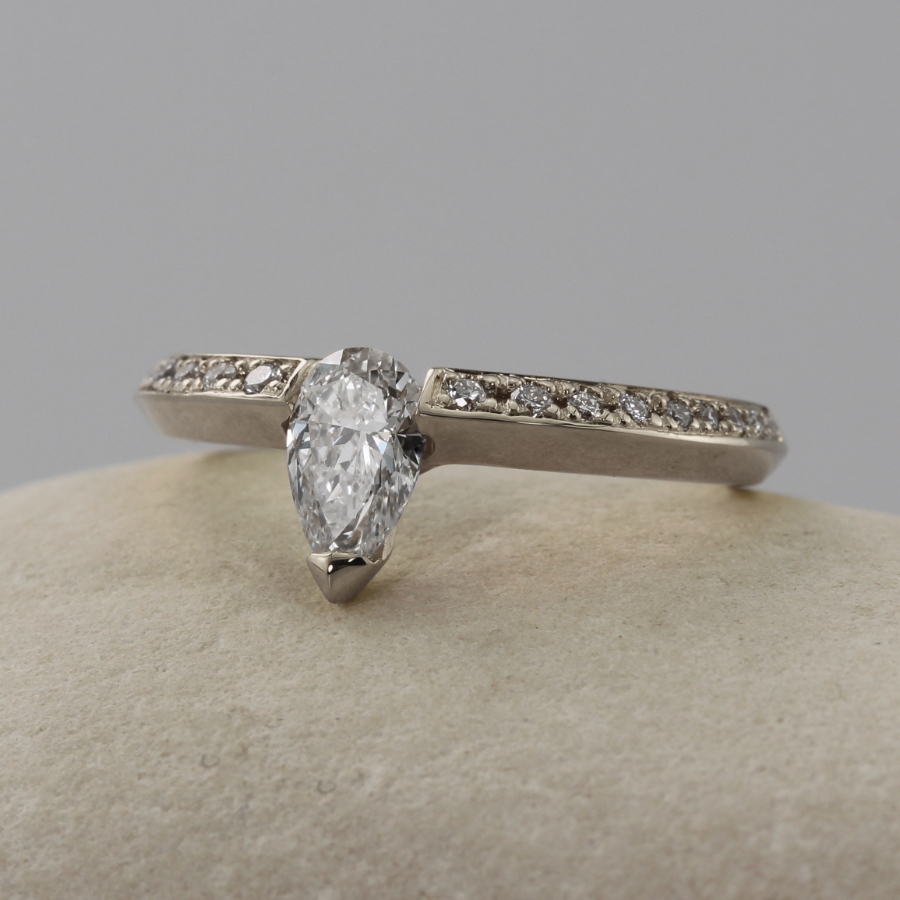 A unique 18ct white gold engagement ring with a striking 0.75ct pear cut stone held in a tension setting with pavé set shoulders on a contemporary knife edge band. The ring is handmade from ethical recycled gold enhanced using natural river gold, gifted to you by us. Choose from recycled diamonds, lab-grown diamonds or Moissanite.