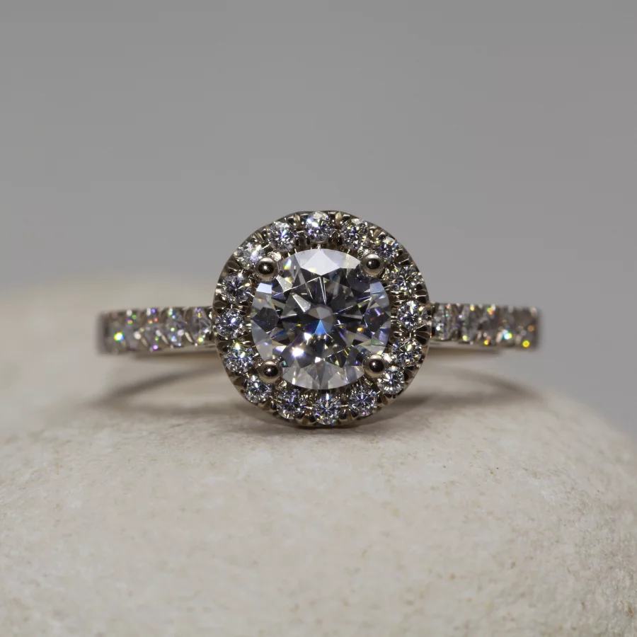 - Stone Shape: One centre round stone with a pavé halo and shoulders