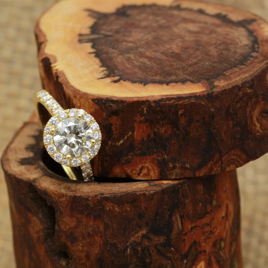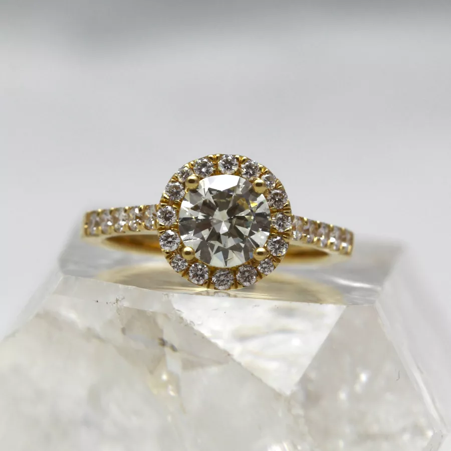 A solid 18ct yellow gold engagement ring with a claw set centre stone and pavé set halo and shoulders. The ring is handmade from ethical recycled gold enhanced using natural river gold, gifted to you by us. We use ethical recycled diamonds, or you can choose from either lab grown diamonds or Moissanite.