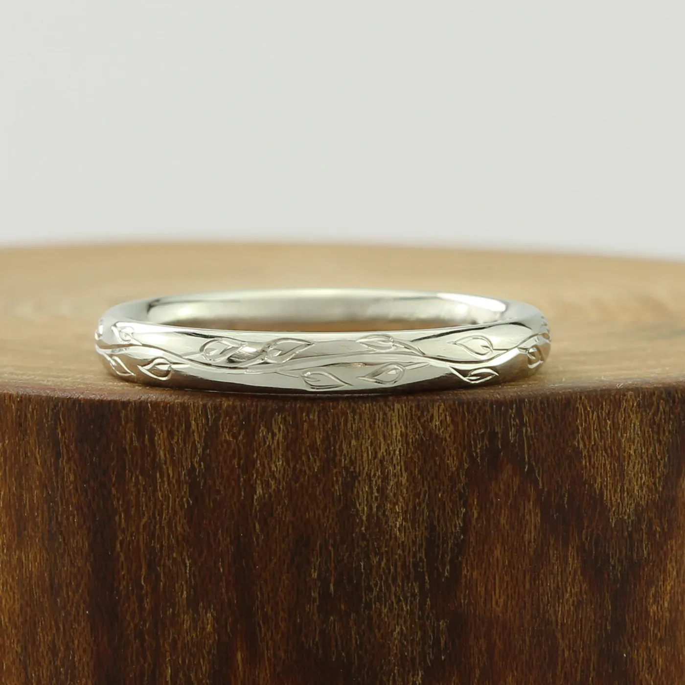 A solid 950 platinum court profile wedding ring with a beautiful, hand engraved leaf design. Handmade from ethical recycled platinum and engraved by hand in our Wetherby Workshop.