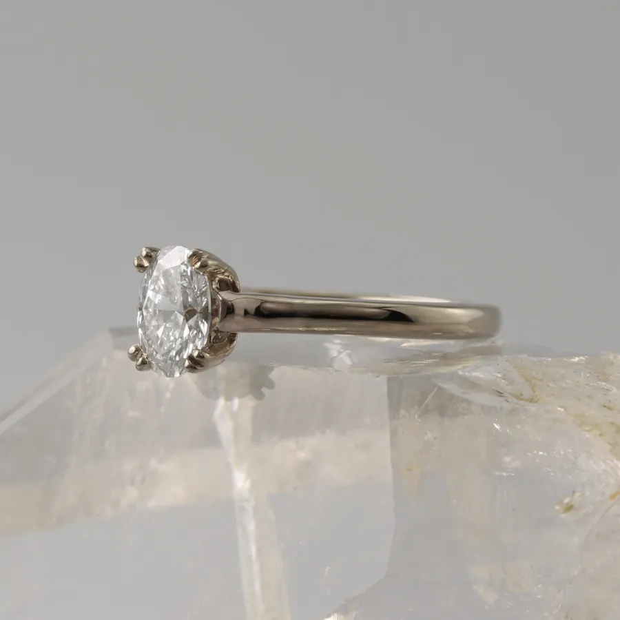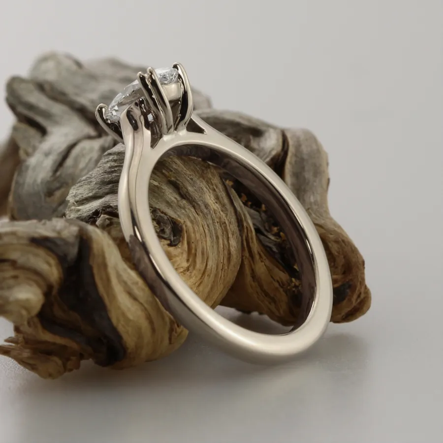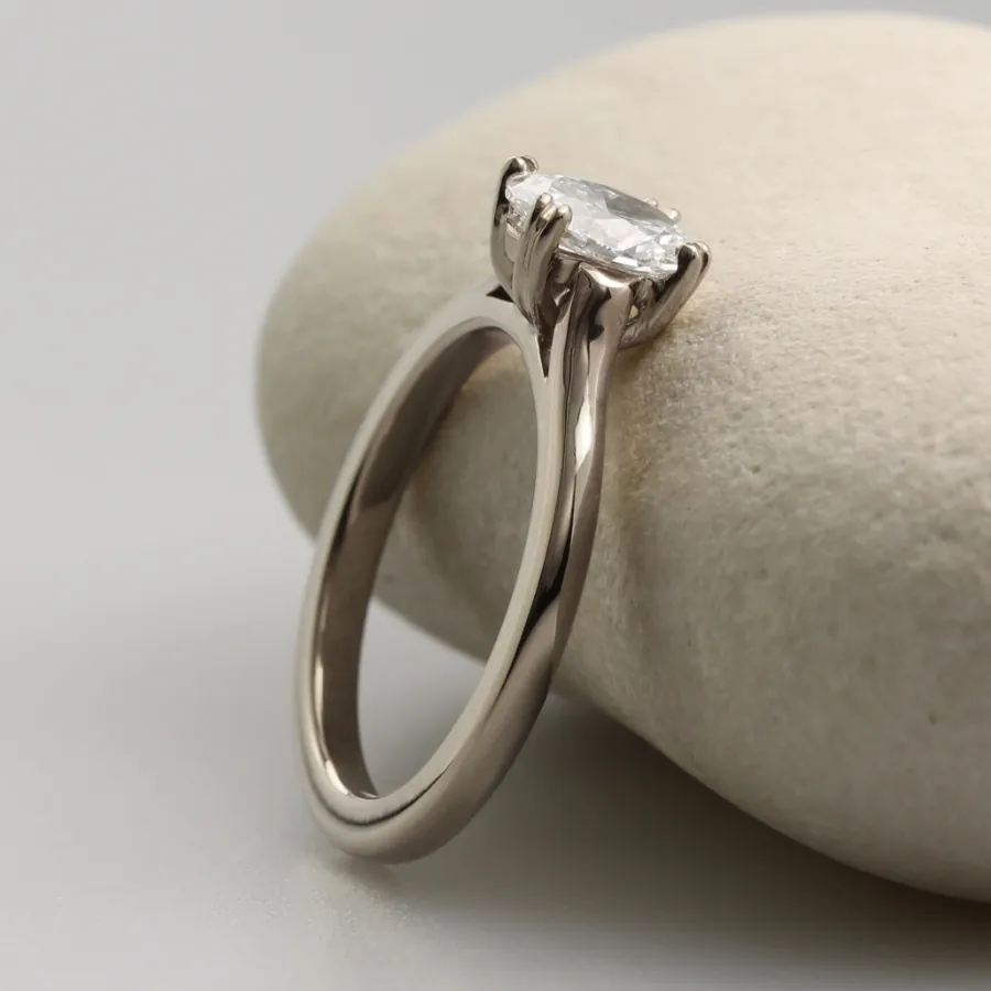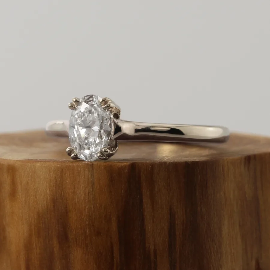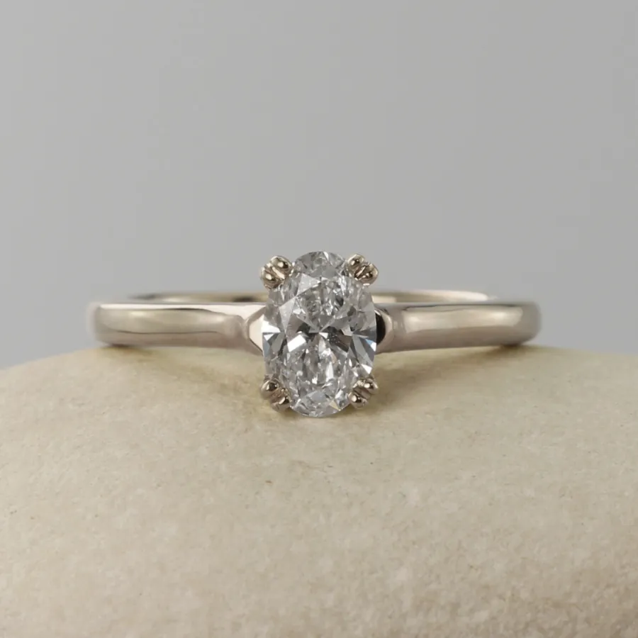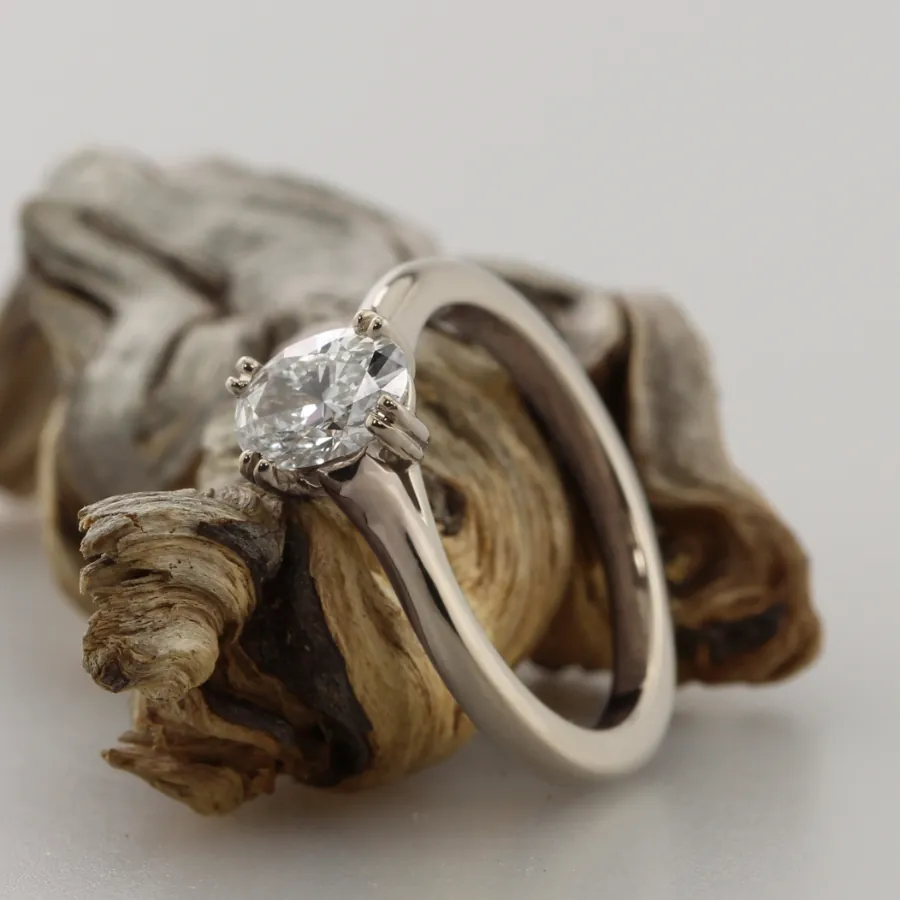 An 18ct white gold wedfit engagement ring with a split shank and a beautiful oval stone set with split claws. The ring is handmade from ethical recycled gold enhanced using natural river gold, gifted to you by us. Choose from a recycled diamond, lab-grown diamond or Moissanite.