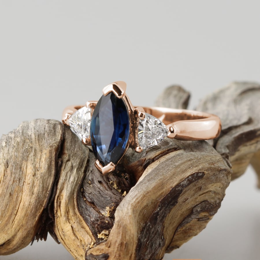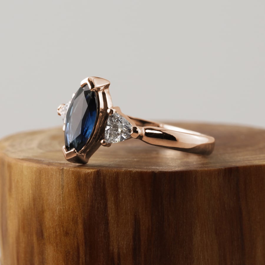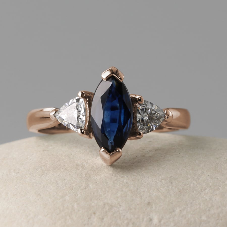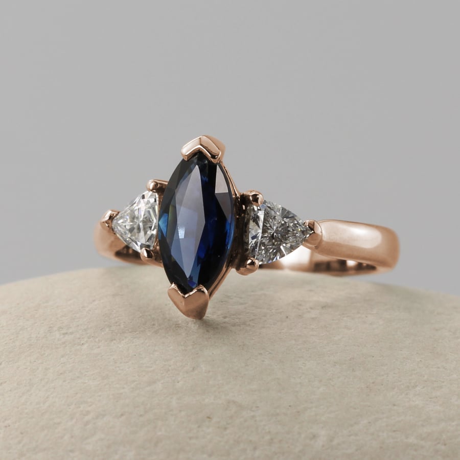 A 14ct rose gold engagement ring with a claw set 1.0ct marquise cut sapphire and 0.25ct trilliant cut shoulder diamonds. The ring is handmade from ethical recycled gold enhanced using natural river gold, gifted to you by us. Choose your river gold location to make your ring extra special.