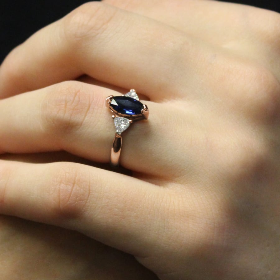 Stones: 1.0ct Marquise cut Sapphire with 0.25ct Trilliant cut lab grown diamonds