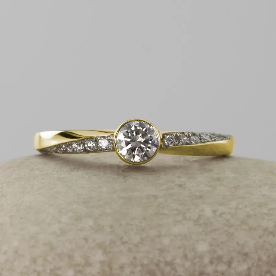 A solid 14ct yellow gold twist engagement ring with a rub over set centre stone and pavé set shoulders. The ring is handmade from ethical recycled gold enhanced using natural river gold, gifted to you by us. We use ethical recycled diamonds, or you can choose from either lab grown diamonds or Moissanite.