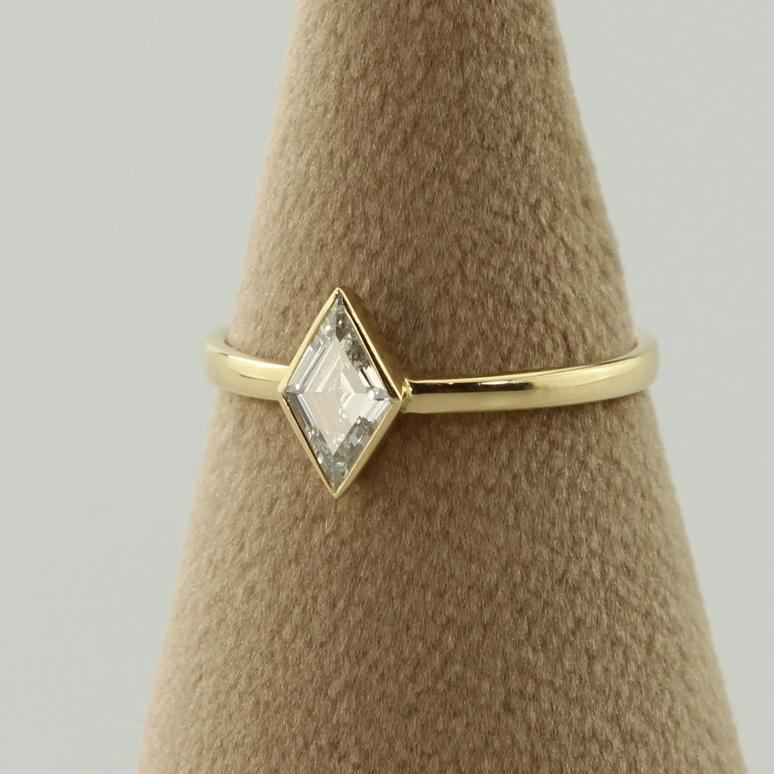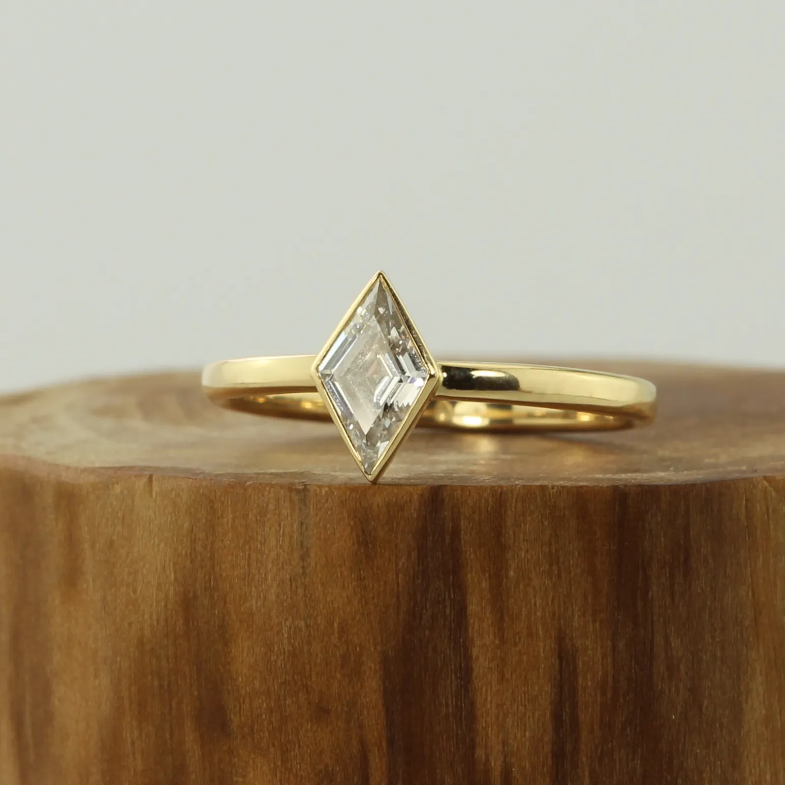 A 14ct gold engagement ring with a beautiful lozenge stone within a bezel setting – choose from either an ethical lab-grown diamond or Moissanite. The ring is sustainably handmade-to-order from ethical recycled gold and enhanced using natural river gold, gifted to you by us – select the location of your river gold to make your ring extra special.