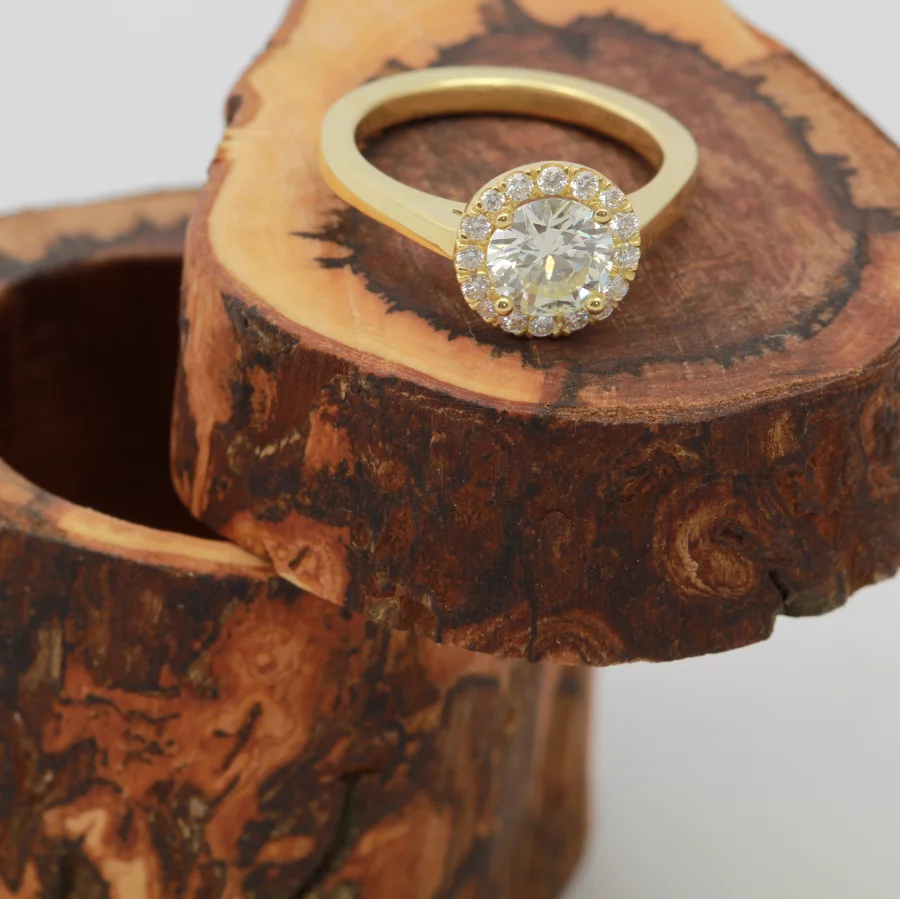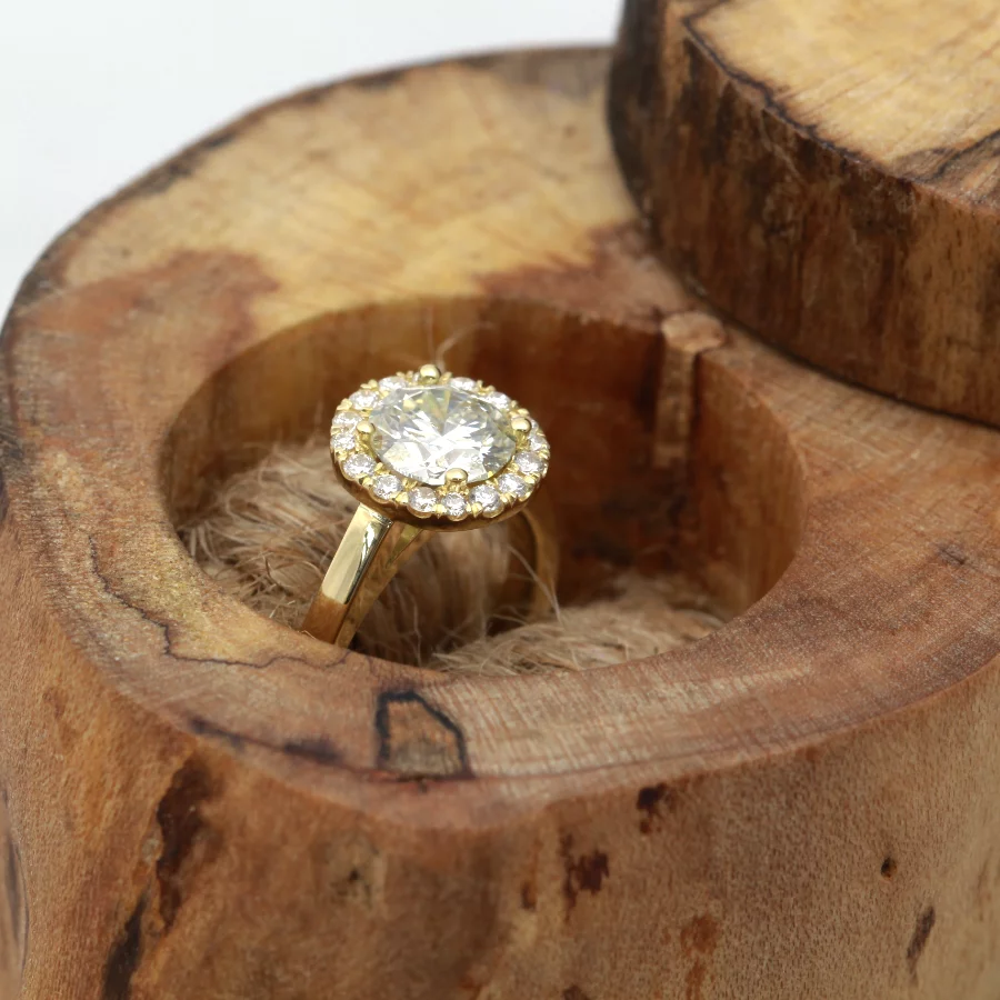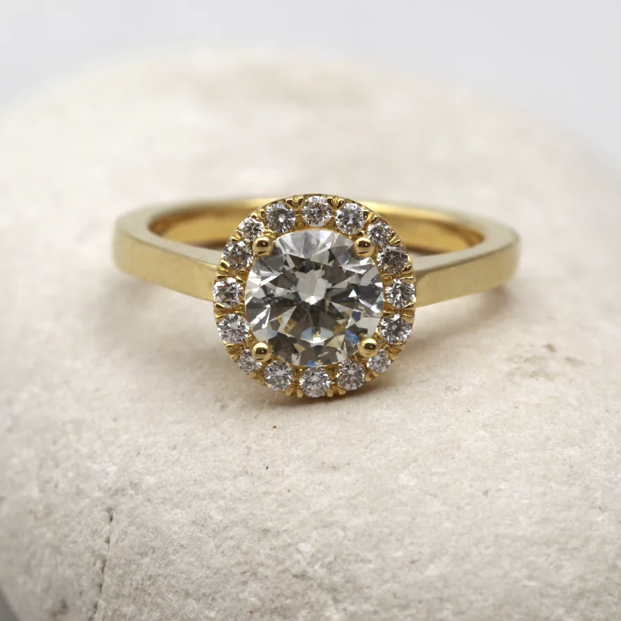 A solid 18ct yellow gold engagement ring with a claw set centre stone and pavรฉ set halo. The ring is handmade from ethical recycled gold enhanced using natural river gold, gifted to you by us. We use ethical recycled diamonds, or you can choose from either lab grown diamonds or Moissanite.