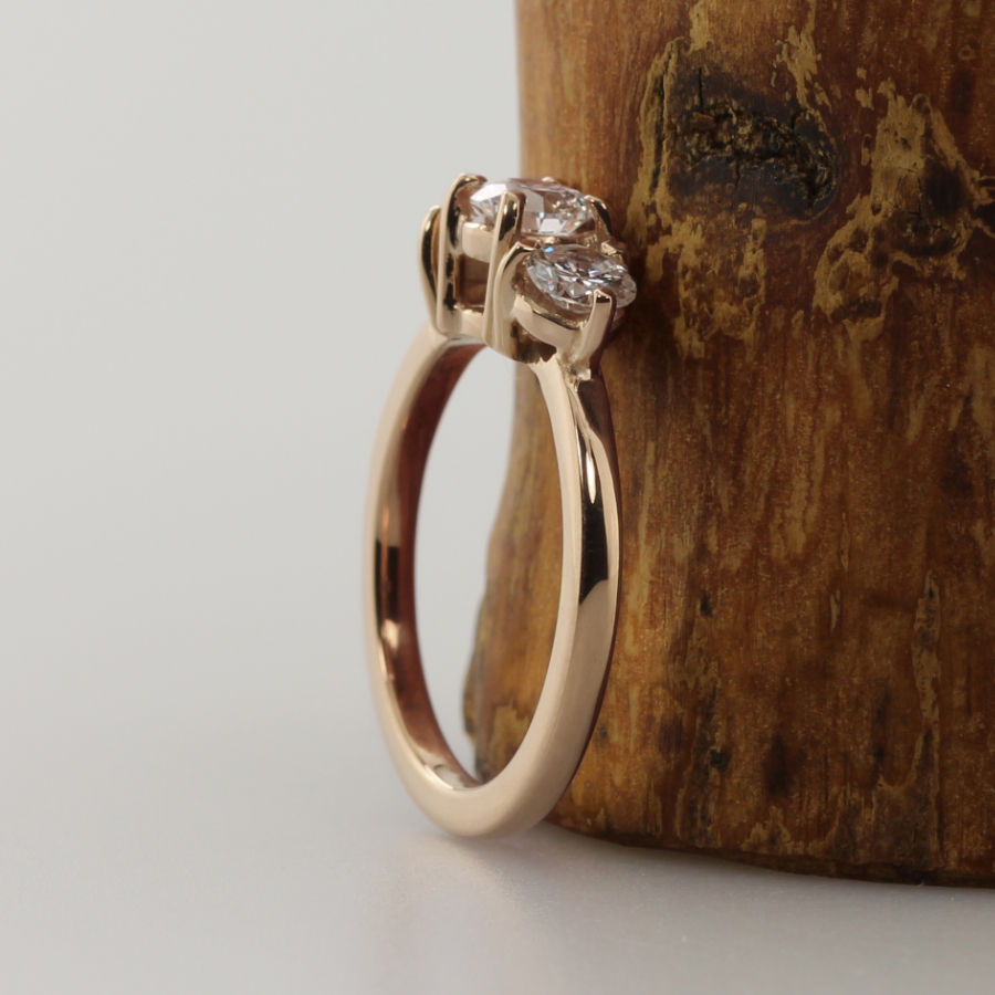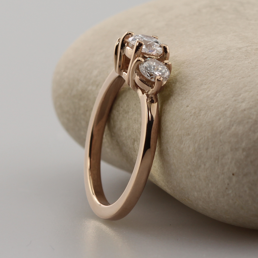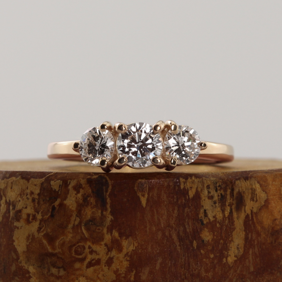 A 14ct rose gold engagement ring with three claw set stones. The ring is handmade from ethical recycled gold enhanced using natural river gold, gifted to you by us. Choose from recycled diamonds, lab grown diamonds or Moissanite. The ring has a 0.50ct/5mm round centre stone and two 0.40ct/4.5mm round stones.