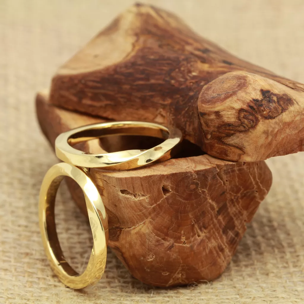 We don’t cast our rings, But for a pair of wedding rings we can do even better than casting them from the same mould. Every ring we make is individually handcrafted using traditional techniques, from making our own alloys, to drawing our own wire. If you buy a pair of rings in the same metal, we always make both your rings from the same melt, meaning they are chemically inseparable.  If you buy a pair of rings but in different metals, we can usually incorporate a bead of each metal in the underside of each of the others’ rings, so your rings can still be connected at the atomic scale.