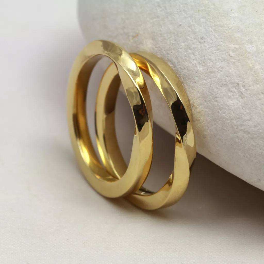 A matching pair of solid 14ct yellow gold square twist profile wedding rings with a polished finish. The rings are handmade from ethical recycled gold and enhanced using natural river gold, gifted to you by us. Choose your river gold location to make your rings extra special. Available in 14ct yellow gold, 14ct rose gold, 14ct white gold, 18ct yellow gold, 18ct rose gold, 18ct white gold or 950 platinum.   Like this ring design but would like them in a different metal, width or depth?  Drop us an email and we’ll send you a quote so you can have your perfect wedding rings.
