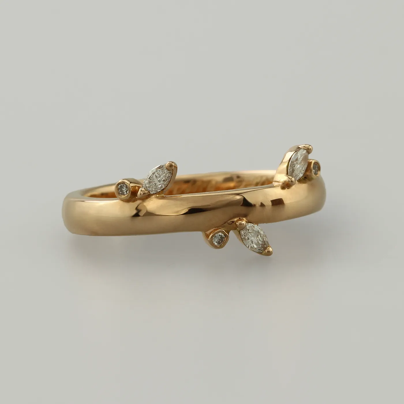 A solid 18ct rose gold wedding ring with marquise diamonds. Handmade from ethical recycled gold and enhanced using natural river gold from England, Ireland, Scotland and Wales, gifted to you by us.