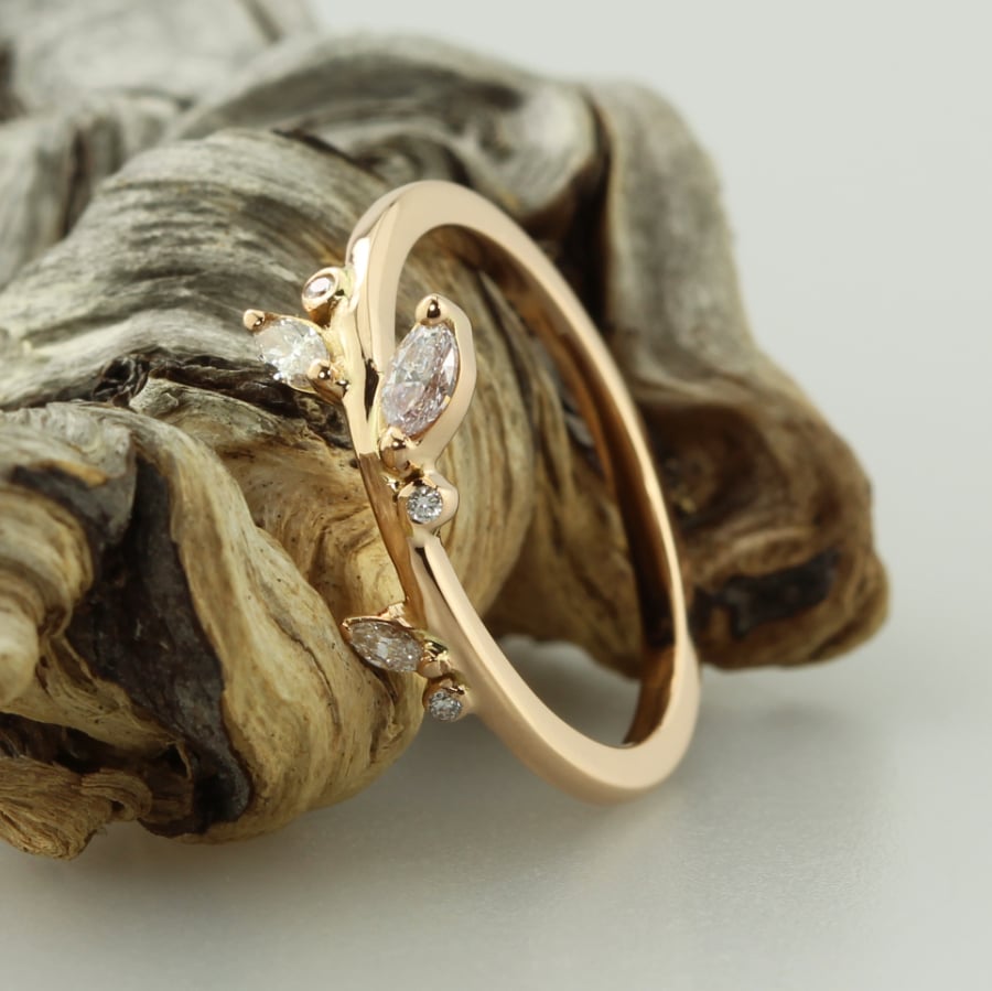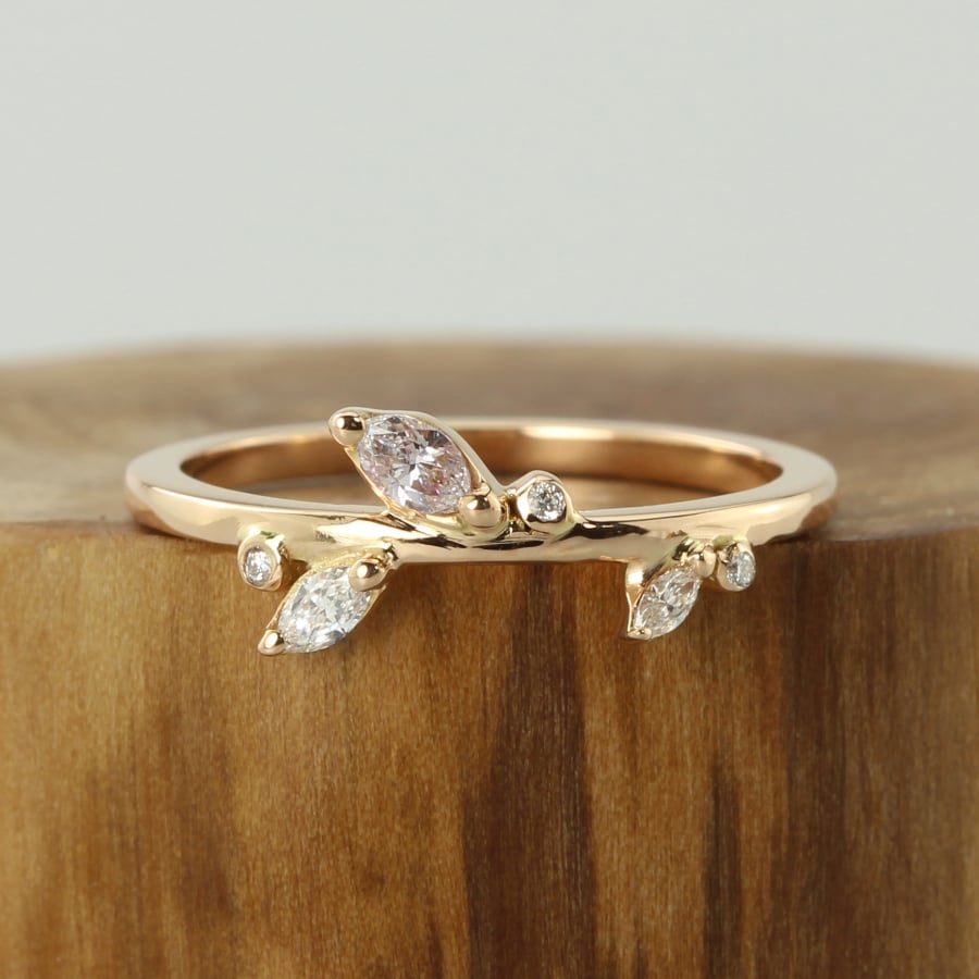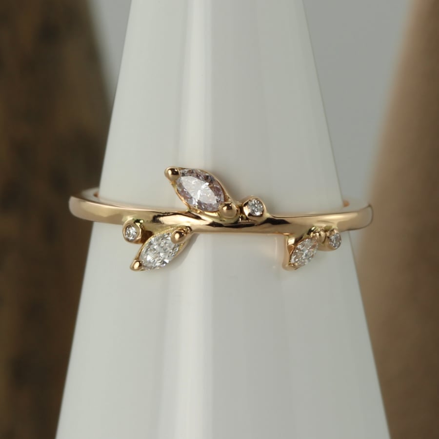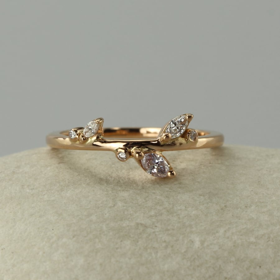 An 18ct rose gold D shape profile wedding ring with marquise and round diamonds. Handmade from ethical recycled gold and enhanced using natural river gold, gifted to you by us. Choose your river gold location to make your ring extra special.