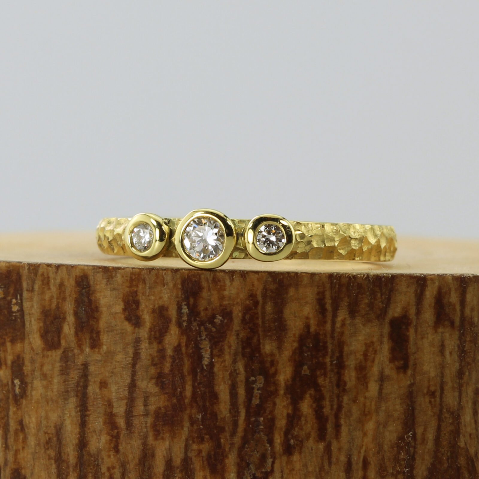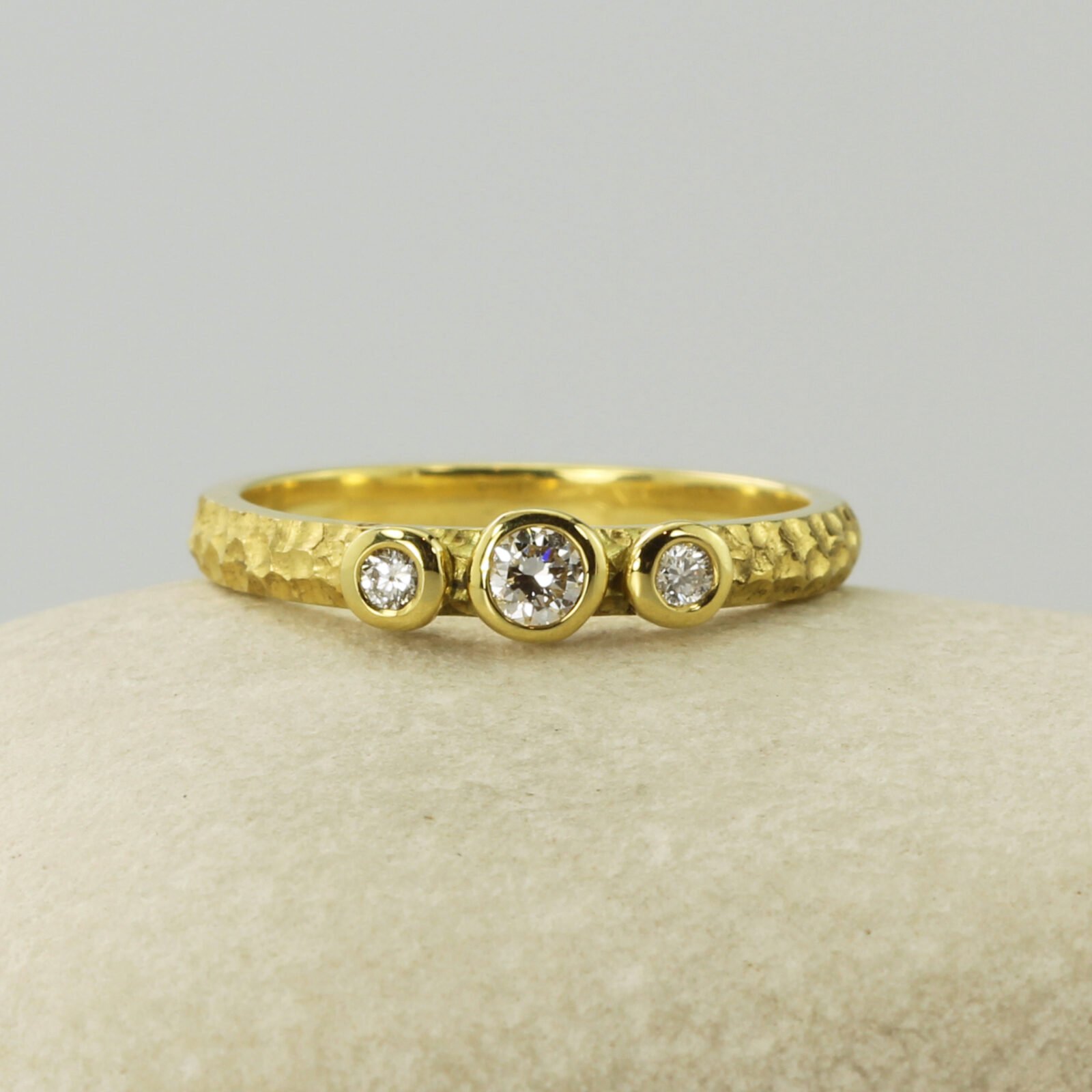 A solid 14ct Yellow Gold engagement ring with three rub over set stones. The ring is handmade from ethical recycled gold enhanced using natural river gold, gifted to you by us. We use ethical recycled diamonds, or you can choose from either lab grown diamonds or Moissanite. The ring has a 3mm round centre stone and two 2mm round stones.
