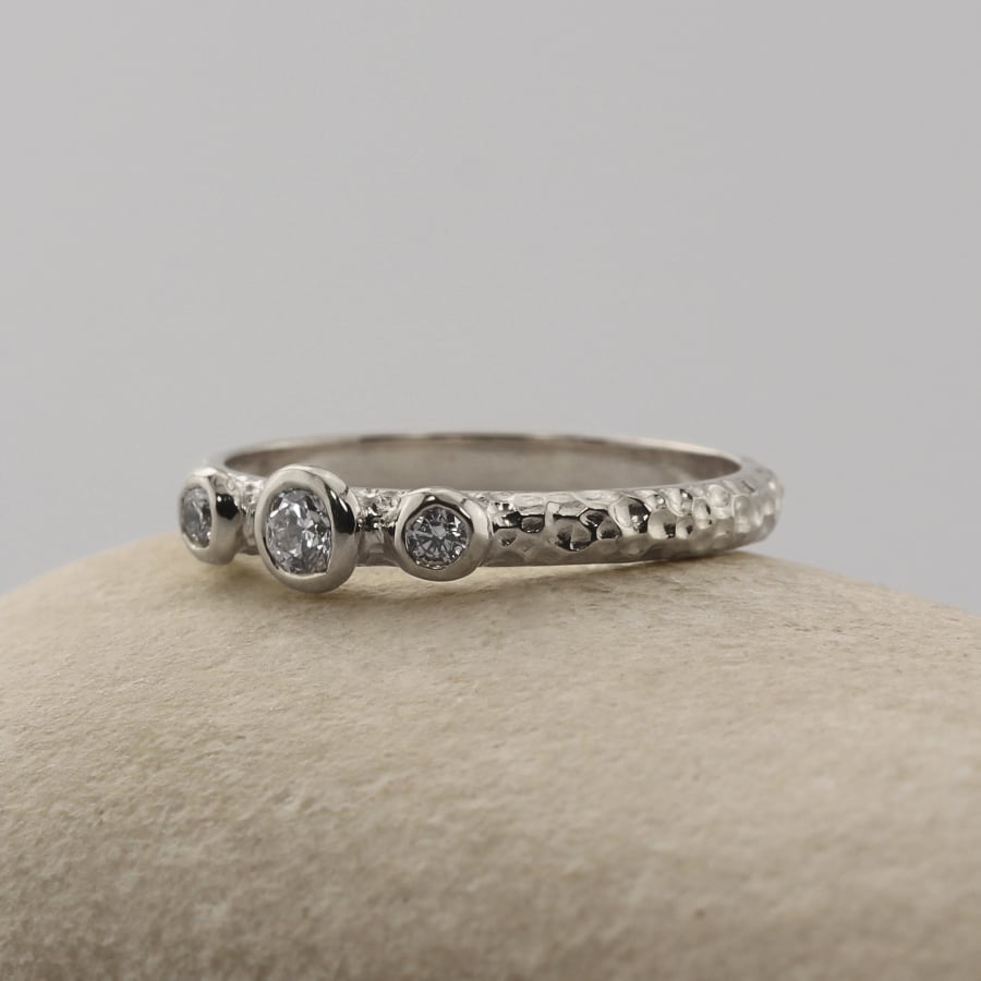 - Stone Shape: One centre 3mm round and two 2mm round Recycled or Lab Grown Diamonds or Moissanite