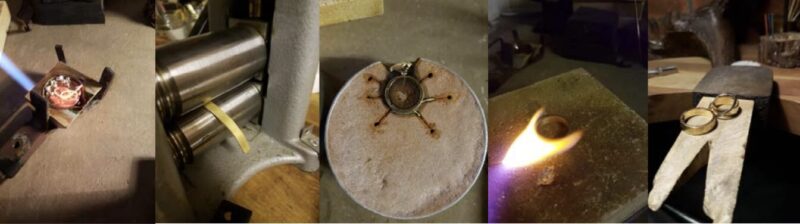 This pair of wedding rings were handmade by Jacqueline & Edward for David and Liz in 2017. The spinner ring comprises a hammered finish concave 18ct recycled gold ring with a beaten finished eco silver spinner. The reticulated ring comprises a flat profile 18ct recycled gold ring with warped edges . The recycled gold, which originates from an American Gold Eagle $50 coin was a family heirloom donated by Liz which was fused with gold panned from Carie Burn, which flows past David’s Family home. The gold was in part panned by the hands of David and Liz. A truly special combination. Both rings were made using the same molten bead of gold.